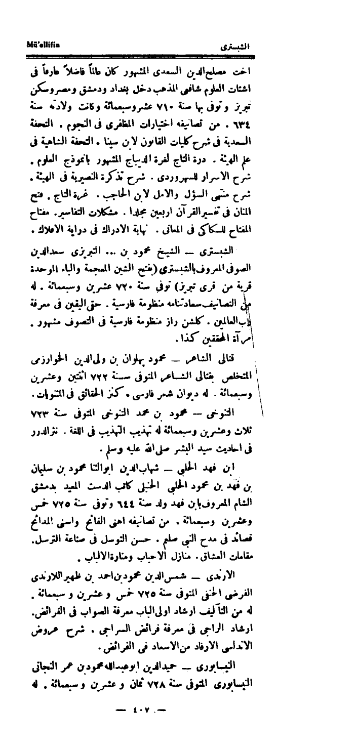 الشبسترى الشَّيْخ مَحْمُود بن..التبريزي سعد الدَّين الصوفى الْمَعْرُوف بالشبسترى (بِفَتْح الشين الْمُعْجَمَة وَالْبَاء الْمُوَحدَة قَرْيَة من قرى تبريز) توفى سنة 720 عشْرين وَسَبْعمائة.
