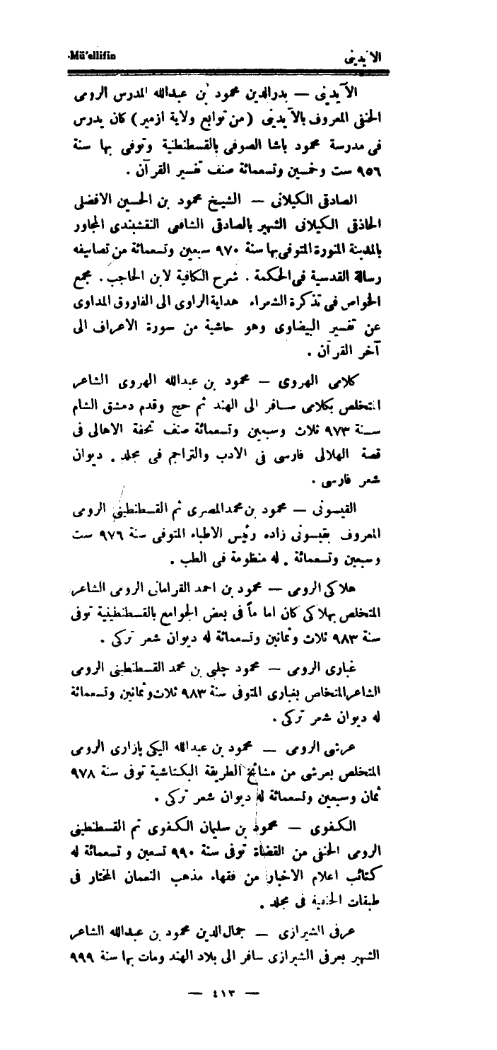 هلاكى الرُّومِي مَحْمُود بن احْمَد القرامانى الرُّومِي الشَّاعِر المتخلص بهلاكي كَانَ اماما فِي بعض الْجَوَامِع بِالْقُسْطَنْطِينِيَّةِ توفى سنة 983 ثَلَاث وَثَمَانِينَ وَتِسْعمِائَة لَهُ ديوَان شعر تركي.