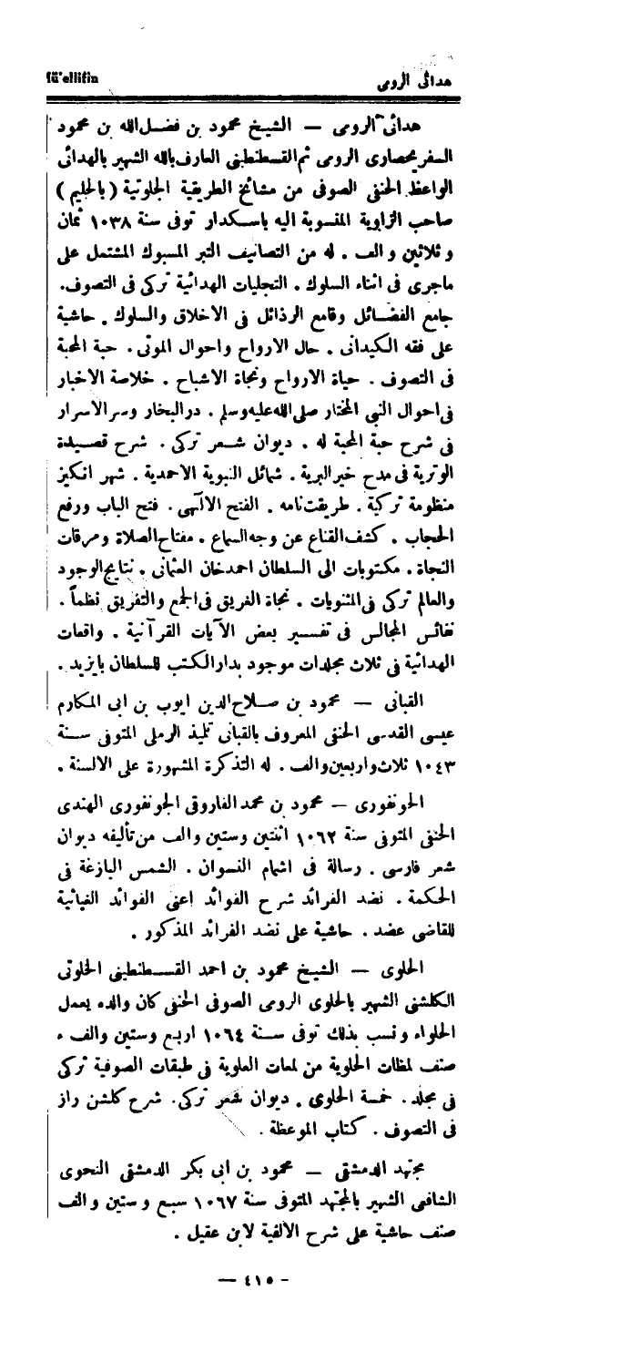هدائى الرُّومِي الشَّيْخ مَحْمُود بن فضل الله بن مَحْمُود السّفر يحصارى الرُّومِي ثمَّ القسطنطيني الْعَارِف بِاللَّه الشهير بالهدائى الْوَاعِظ الْحَنَفِيّ الصوفى من مشائخ الطريقية الجلوتية (بالجليم) صَاحب الزاوية المنسوبة إِلَيْهِ باسكدار توفى سنة 1038 ثَمَان وَثَلَاثِينَ والف.