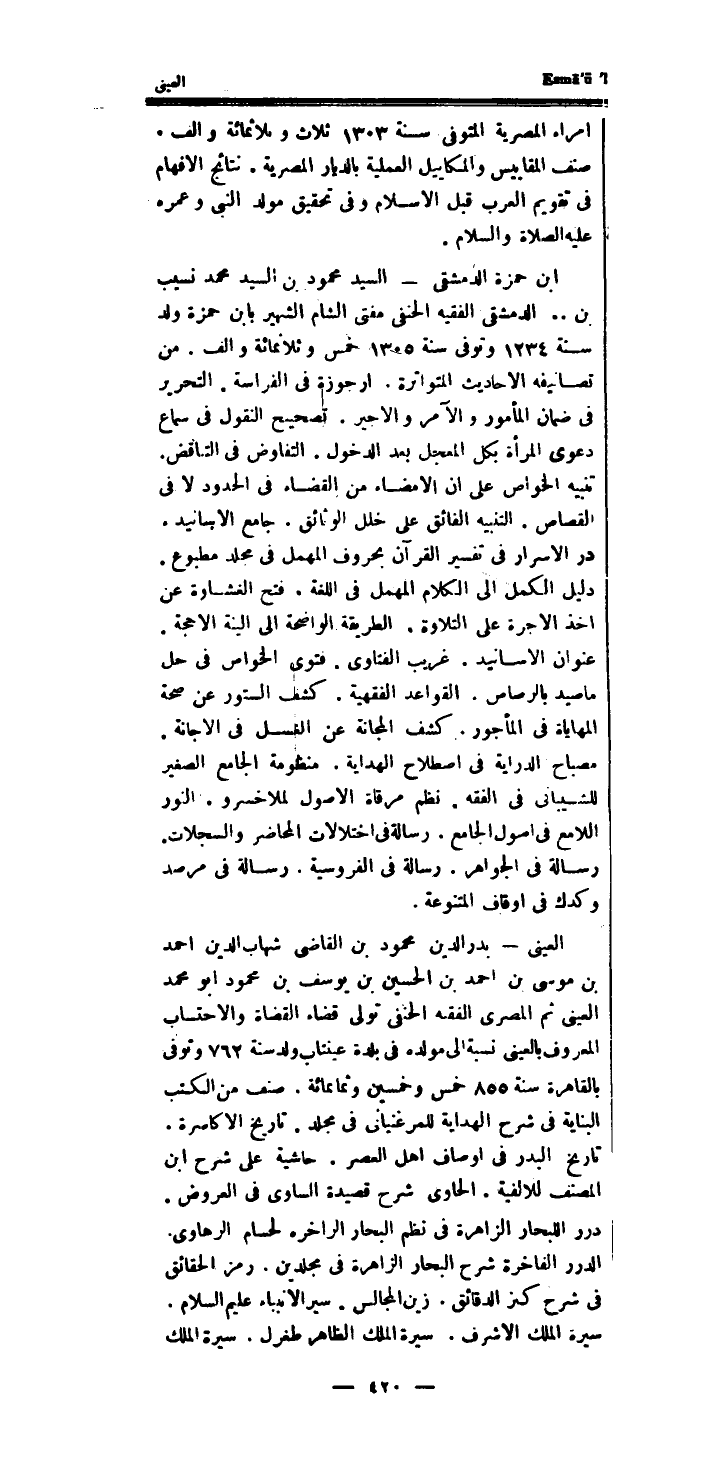 العينى بدر الدَّين مَحْمُود بن القاضى شهَاب الدَّين احْمَد بن مُوسَى بن احْمَد بن الْحُسَيْن بن يُوسُف بن مَحْمُود أَبُو مُحَمَّد العينى ثمَّ المصرى الْفِقْه الْحَنَفِيّ تولى قَضَاء الْقُضَاة والاحتساب الْمَعْرُوف بالعينى نِسْبَة إِلَى مولده فِي بَلْدَة عينتاب ولد سنة 762 وَتوفى بِالْقَاهِرَةِ سنة 855 خمس وَخمسين وَثَمَانمِائَة.