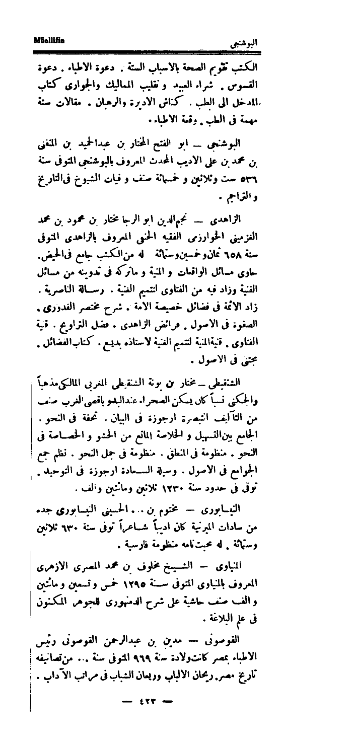 البوشنجى أَبُو الْفَتْح الْمُخْتَار بن عبد الحميد بن المنفنى بن مُحَمَّد بن على الاديب الْمُحدث الْمَعْرُوف بالبوشنجى الْمُتَوفَّى سنة 536 سِتّ وَثَلَاثِينَ وَخَمْسمِائة صنف وفيات الشُّيُوخ فِي التَّارِيخ والتراجم.