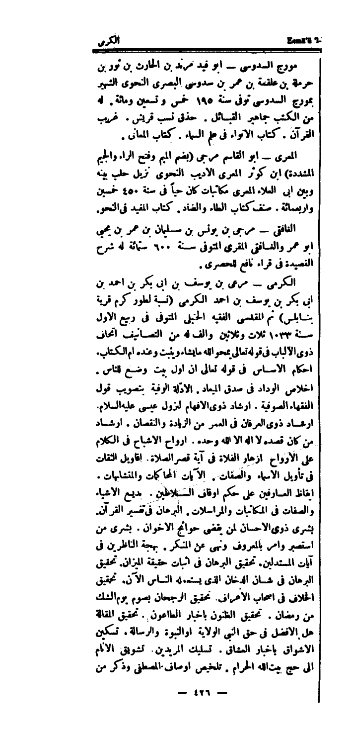 الكرمى - مرعى بن يُوسُف بن ابى بكر بن احْمَد بن ابى بكر بن يُوسُف بن احْمَد الكرمى (نِسْبَة لطور كرم قَرْيَة بنابلس) ثمَّ الْمَقْدِسِي الْفَقِيه الحنبلى الْمُتَوفَّى فِي ربيع الاول سنة 1033 ثَلَاث وَثَلَاثِينَ والف لَهُ من التصانيف اتحاف ذوى الالباب فِي قَوْله تَعَالَى يمحو الله مَا يَشَاء وَيثبت وَعِنْده ام الْكتاب.