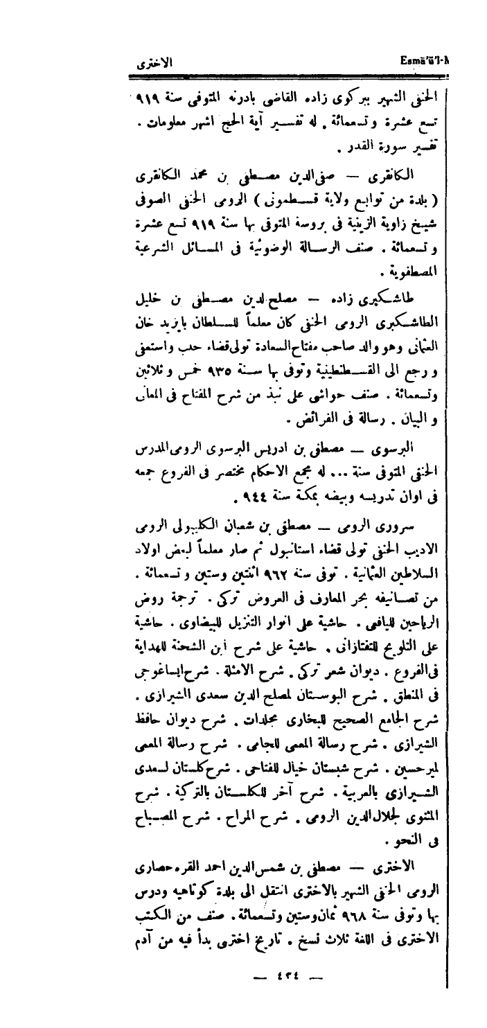 الاخترى مصطفى بن شمس الدَّين احْمَد القره حصارى الرُّومِي الْحَنَفِيّ الشهير بالاخترى انْتقل إِلَى بَلْدَة كوتاهيه ودرس بهَا وَتوفى سنة 968 ثَمَان وَسِتِّينَ وَتِسْعمِائَة.