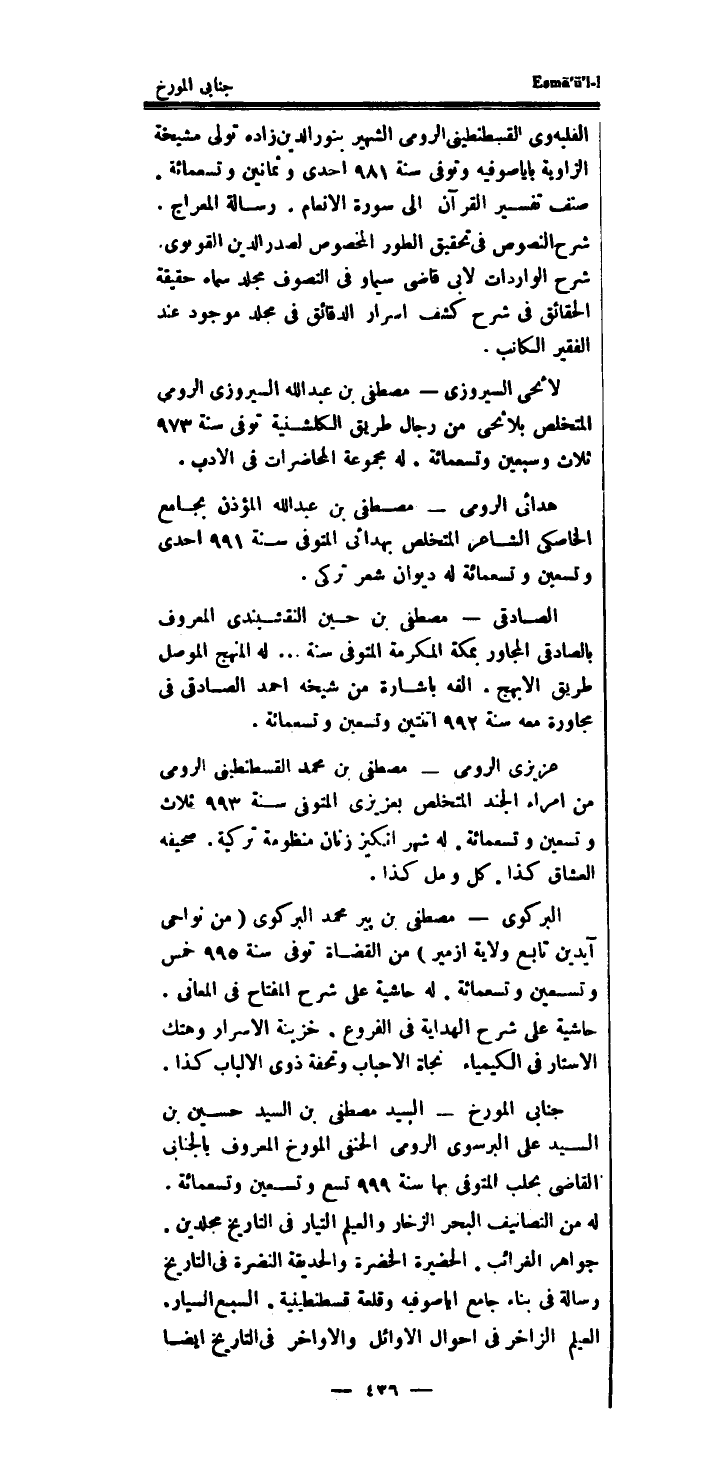 جنابي المورخ السَّيِّد مصطفى بن السَّيِّد حُسَيْن بن السَّيِّد على البرسوى الرُّومِي الْحَنَفِيّ المورخ الْمَعْرُوف بالجنابى القاضى بحلب الْمُتَوفَّى بهَا سنة 999 تسع وَتِسْعين وَتِسْعمِائَة.