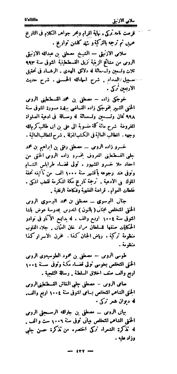 سلامى الازنيقى الشَّيْخ مصطفى بن عبد الله الازنيقى الرُّومِي من مشائخ الزينية نزيل الْقُسْطَنْطِينِيَّة الْمُتَوفَّى سنة 993 ثَلَاث وَتِسْعين وَتِسْعمِائَة لَهُ دَلَائِل الْهدى.