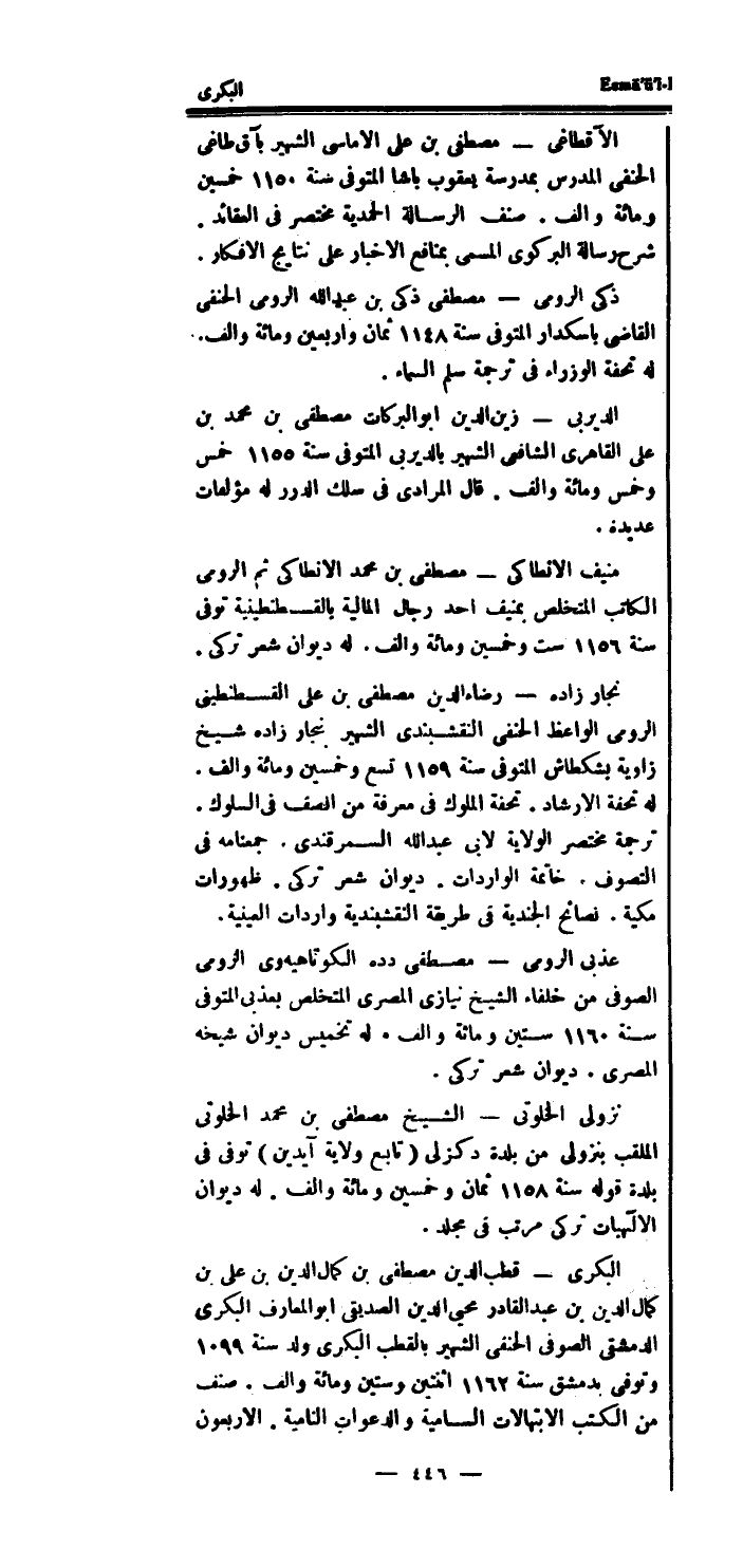 الْبكْرِيّ قطب الدَّين مصطفى بن كَمَال الدَّين بن على بن كَمَال الدَّين بن عبد الْقَادِر محيى الدَّين الصديقى أَبُو المعارف الْبكْرِيّ الدِّمَشْقِي الصوفى الْحَنَفِيّ الشهير بالقطب الْبكْرِيّ ولد سنة 1099 وَتوفى بِدِمَشْق سنة 1162 اثْنَتَيْنِ وَسِتِّينَ وَمِائَة والف.
