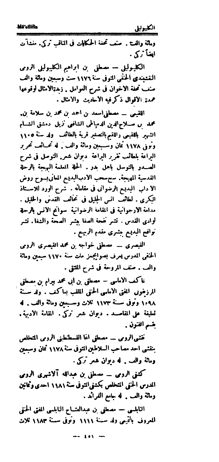 كشفي الرُّومِي مصطفى بن عبد الله آلاشهرى الرُّومِي الْمدرس الْحَنَفِيّ المتخلص بكشفي الْمُتَوفَّى سنة 1181 احدى وَثَمَانِينَ وَمِائَة والف.
