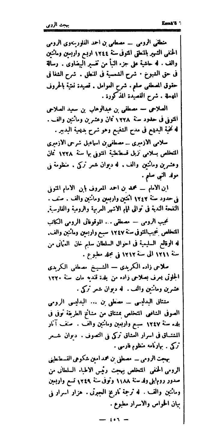 بهجت الرُّومِي مصطفى بن مُحَمَّد امين شكوهى القسطنطيني الرُّومِي الْحَنَفِيّ المتخلص ببهجت رَئِيس الاطباء السلطاني من صُدُور روم ايلى ولد سنة 1188 وَتوفى سنة 1249 تسع واربعين وَمِائَتَيْنِ والف.
