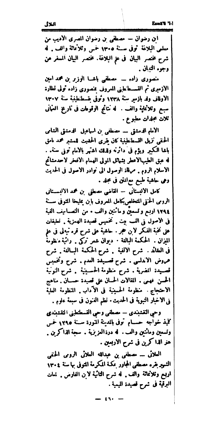كَامِل الالبستانى القاضى بن مُحَمَّد الالبستانى الرُّومِي الْحَنَفِيّ المتخلص بكامل الْمَعْرُوف بِابْن يمليخا الْمُتَوفَّى سنة 1294 ارْبَعْ وَتِسْعين وَمِائَتَيْنِ والف.