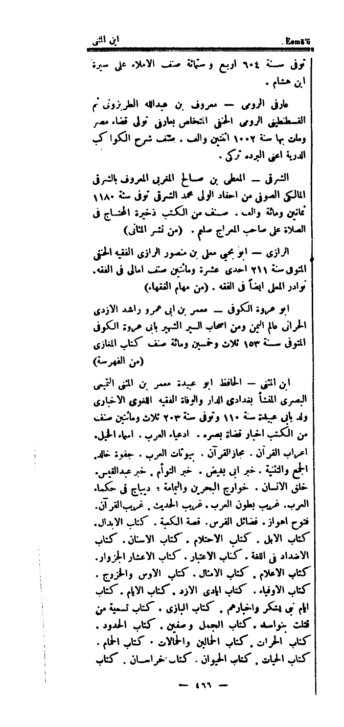 (من مهام الْفُقَهَاء) ابو عُرْوَة الكوفى معمر بن ابى عَمْرو رَاشد الازدي الحرانى عَالم الْيمن وَمن اصحاب السّير الشهير بابى عُرْوَة الكوفى الْمُتَوفَّى سنة 153 ثَلَاث وَخمسين وَمِائَة صنف كتاب المغازى (من الفهرسة) ابْن الْمثنى الْحَافِظ أَبُو عُبَيْدَة معمر بن الْمثنى التَّمِيمِي الْبَصْرِيّ المنشأ بغدادي الدَّار والوفاة الْفَقِيه اللغوى الاخباري ولد بابى عُبَيْدَة سنة 110 وَتوفى سنة 203 ثَلَاث وَمِائَتَيْنِ صنف من الْكتب اخبار قُضَاة بَصَره.