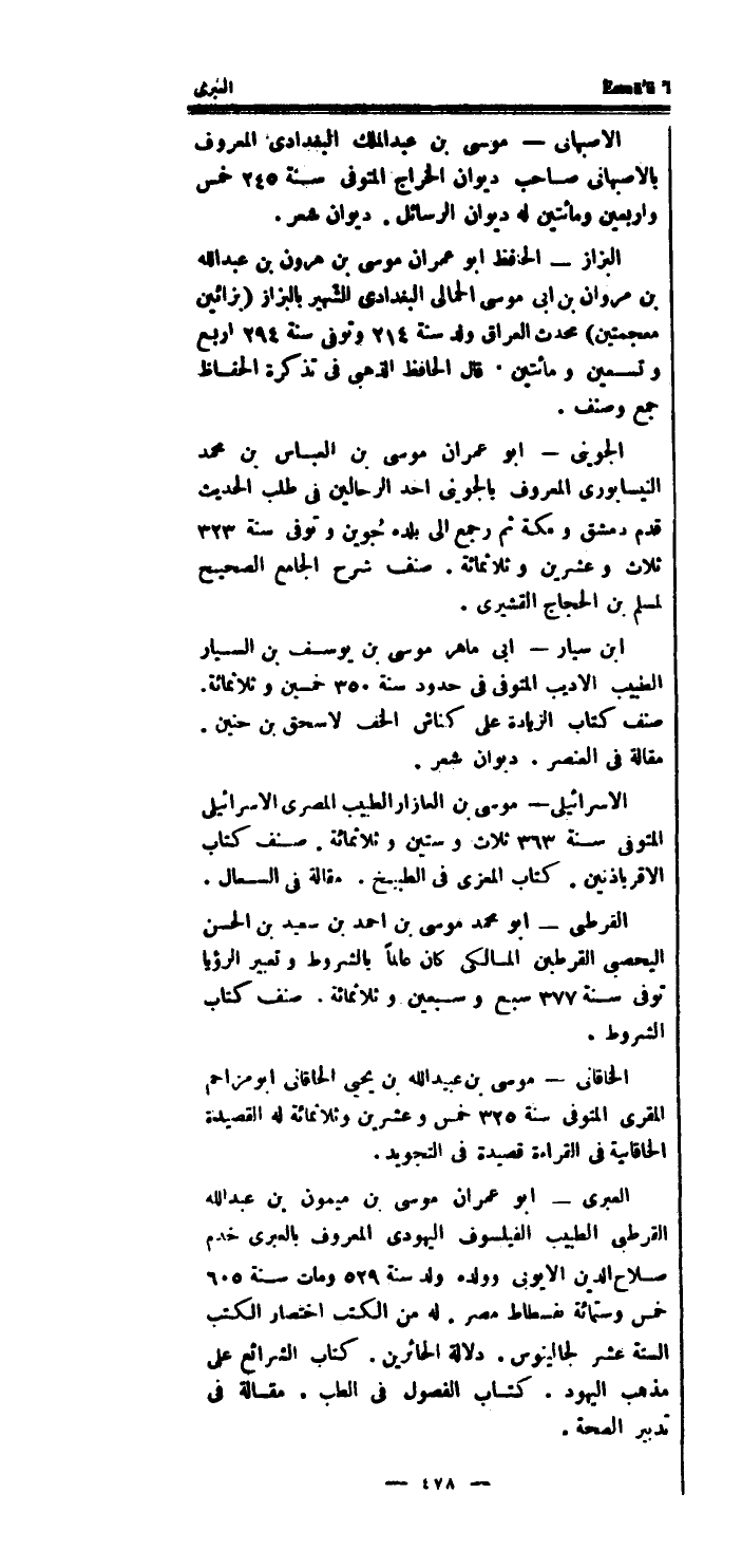 الْبَزَّاز الْحَافِظ أَبُو عمرَان مُوسَى بن هرون بن عبد الله بن مَرْوَان بن ابى مُوسَى الحمالى الْبَغْدَادِيّ الشهير بالبزاز (بزائين معجمتين) مُحدث الْعرَاق ولد سنة 214 وَتوفى سنة 294 ارْبَعْ وَتِسْعين وَمِائَتَيْنِ.
