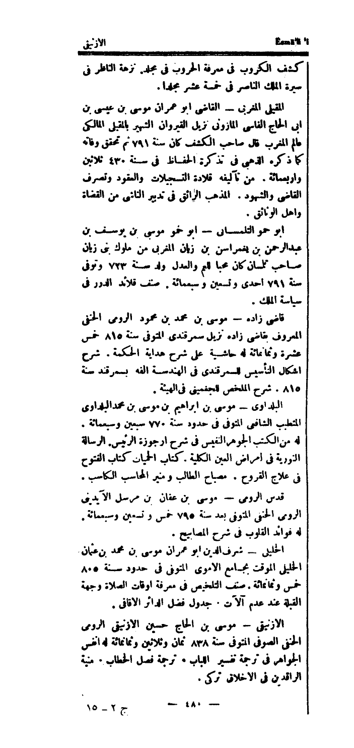 قاضى زَاده مُوسَى بن مُحَمَّد بن مَحْمُود الرُّومِي الْحَنَفِيّ الْمَعْرُوف بقاضي زَاده نزيل سمرقندي الْمُتَوفَّى سنة 815 خمس عشرَة وَثَمَانمِائَة لَهُ حَاشِيَة على شرح هِدَايَة الْحِكْمَة.