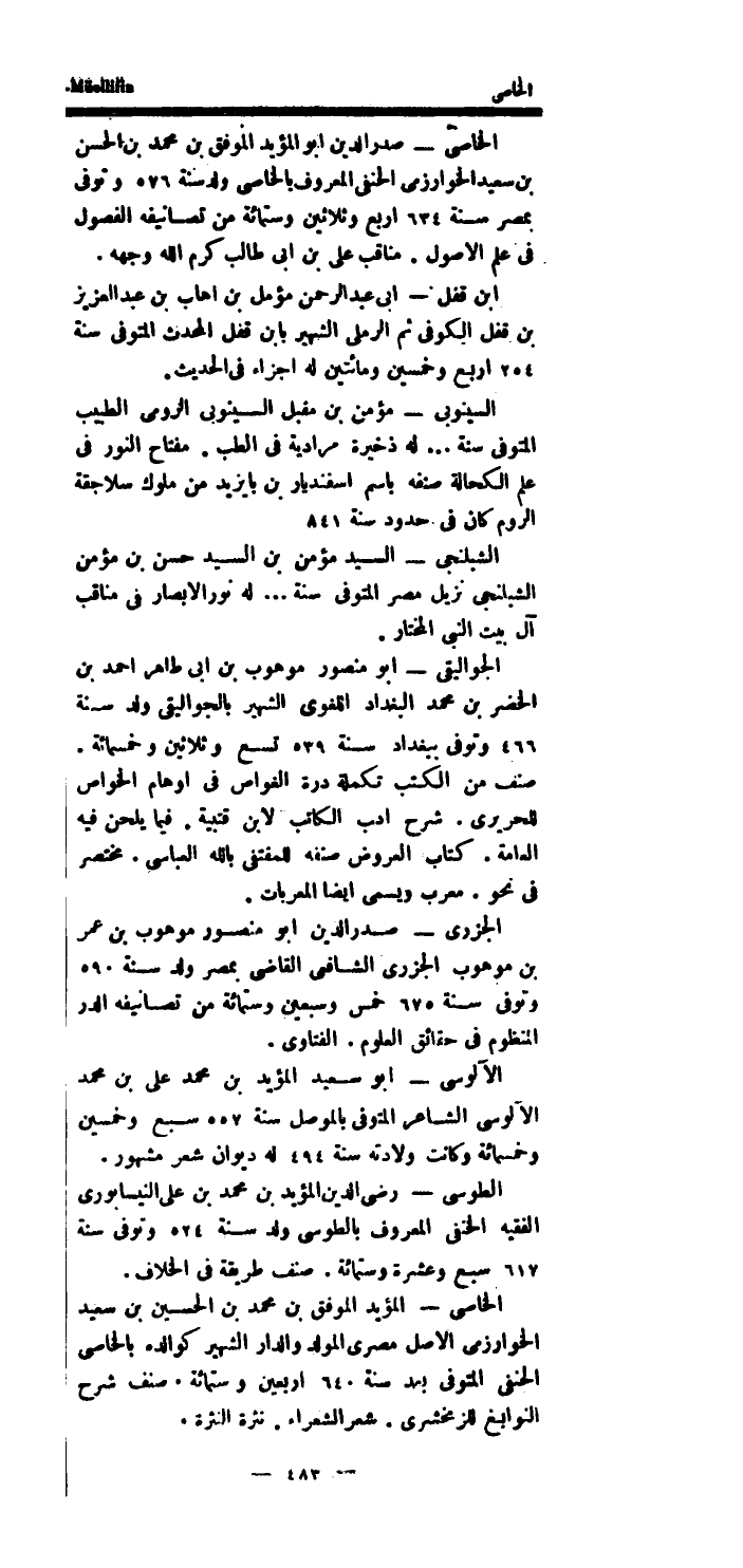 الخاصى الْمُؤَيد الْمُوفق بن مُحَمَّد بن الْحُسَيْن بن سعيد الْخَوَارِزْمِيّ الاصل مصرى المولد وَالدَّار الشهير كوالده بالخاصى الْحَنَفِيّ الْمُتَوفَّى بعد سنة 640 اربعين وسِتمِائَة.