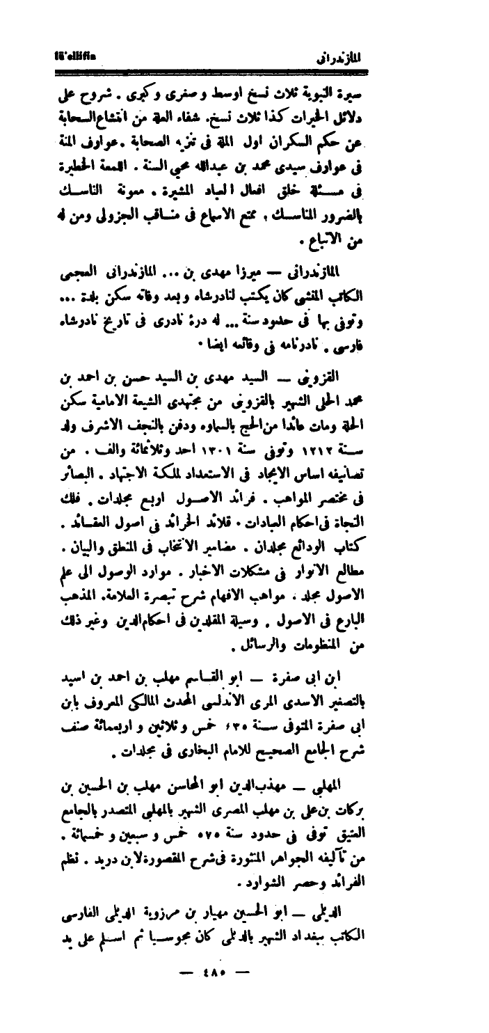 المازندرانى ميرزا مهدى بن..المازندرانى العجمي الْكَاتِب المنشى كَانَ يكْتب لنادر شاه وَبعد وَفَاته سكن بَلْدَة..وَتوفى بهَا فِي حُدُود سنة..لَهُ درهء نادرى فِي تَارِيخ نادرشاه فَارسي.