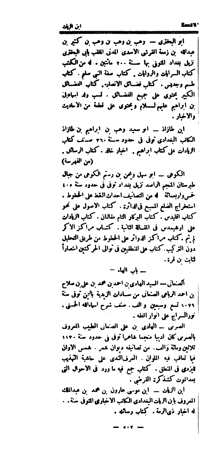 (من الفهرسة) الكوهى أَبُو سهل ويحن بن رستم الكوهى من جبال طبرستان المنجم الراصد نزيل بَغْدَاد توفى فِي حُدُود سنة 405 خمس واربعمائة لَهُ من التصانيف احداث النقط على الخطوط.