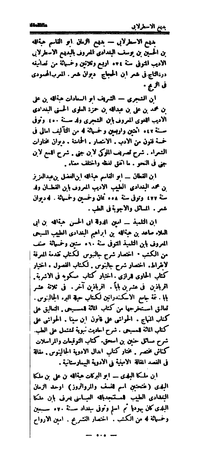 بديع الاسطرلابى بديع الزَّمَان أَبُو الْقَاسِم هبة الله بن الْحُسَيْن بن يُوسُف الْبَغْدَادِيّ الْمَعْرُوف بالبديع الاسطرلابى الاديب الْمُتَوفَّى سنة 534 ارْبَعْ وَثَلَاثِينَ وَخَمْسمِائة من تصانيقه درة التَّاج فِي شعر ابْن الْحجَّاج ديوَان شعر.