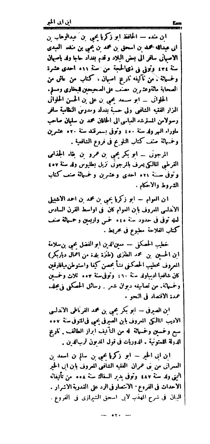 ابْن مَنْدَه الْحَافِظ أَبُو زَكَرِيَّا يحيى بن عبد الْوَهَّاب بن ابى عبد الله مُحَمَّد بن اسحق بن مُحَمَّد بن يحيى بن مَنْدَه العبدى الاصبهاني سَافر إِلَى بعض الْبِلَاد وَقدم بَغْدَاد حَاجا ولد باصبهان سنة 434 وَتوفى فِي ذى الْحجَّة من سنة 511 احدى عشرَة وَخَمْسمِائة.