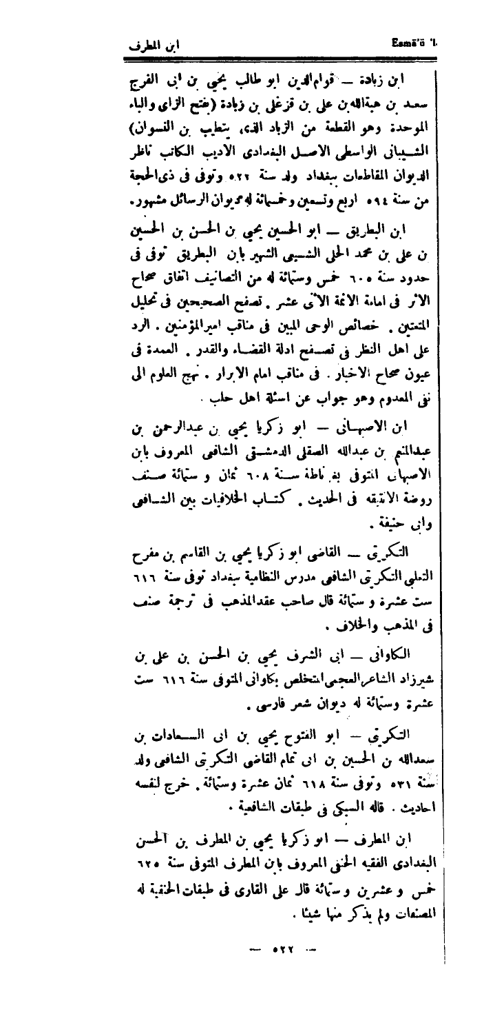 ابْن الْمطرف أَبُو زَكَرِيَّا يحيى بن الْمطرف بن الْحسن الْبَغْدَادِيّ الْفَقِيه الْحَنَفِيّ الْمَعْرُوف بِابْن الْمطرف الْمُتَوفَّى سنة 625 خمس وَعشْرين وسِتمِائَة قَالَ على القارى فِي طَبَقَات الْحَنَفِيَّة لَهُ المصنفات وَلم يذكر مِنْهَا شَيْئا.