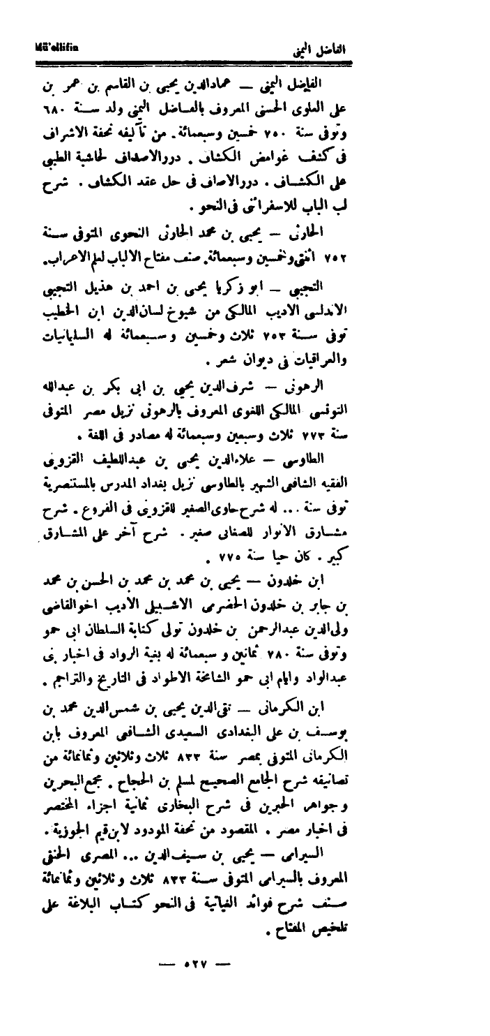 الحارثى يحيى بن مُحَمَّد الحارثى النَّحْوِيّ الْمُتَوفَّى سنة 752 اثنتى وَخمسين وَسَبْعمائة.