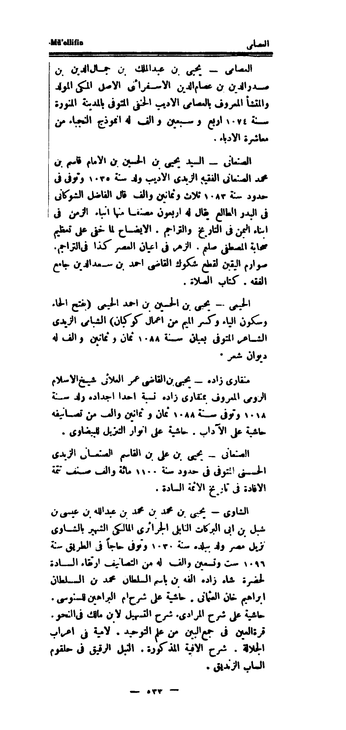 الصنعانى يحيى بن على بن الْقَاسِم الصنعانى الزيدى الْحسنى الْمُتَوفَّى فِي حُدُود سنة 1100 مائَة والف صنف تَتِمَّة الافادة فِي تَارِيخ الائمة السَّادة.