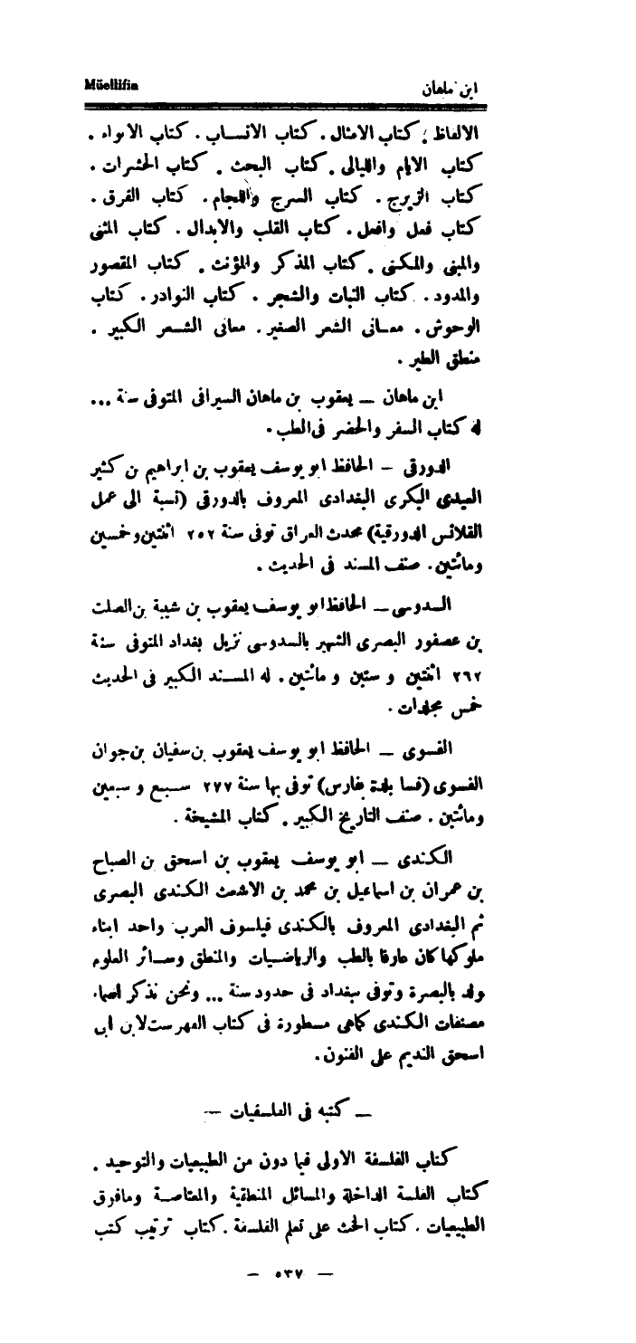 الكندى أَبُو يُوسُف يَعْقُوب بن اسحق بن الصَّباح بن عمرَان بن اسماعيل بن مُحَمَّد بن الاشعث الكندى الْبَصْرِيّ ثمَّ الْبَغْدَادِيّ الْمَعْرُوف بالكندي فيلسوف الْعَرَب وَاحِد ابناء مُلُوكهَا كَانَ عَارِفًا بالطب والرياضيات والمنطق وَسَائِر الْعُلُوم ولد بِالْبَصْرَةِ وَتوفى بِبَغْدَاد فِي حُدُود سنة..وَنحن نذْكر اسماء مصنفات الكندى كماهى مسطورة فِي كتاب الفهرست لِابْنِ ابى اسحق النديم على الْفُنُون.