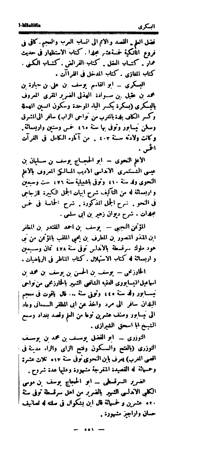 البسكرى أَبُو الْقَاسِم يُوسُف بن على بن حبارة بن مُحَمَّد بن عقيل بن سوَادَة الهذلى الضَّرِير المقرى الْمَعْرُوف بالبسكرى (بسكرة بِكَسْر الْبَاء الْمُوَحدَة وَسُكُون السِّين الْمُهْملَة وَكسر الْكَاف بَلْدَة بالمغرب من نواحى الزاب) سَافر إِلَى الْمشرق وَسكن نيسابور وَتوفى بهَا سنة 465 خمس وَسِتِّينَ واربعمائة.