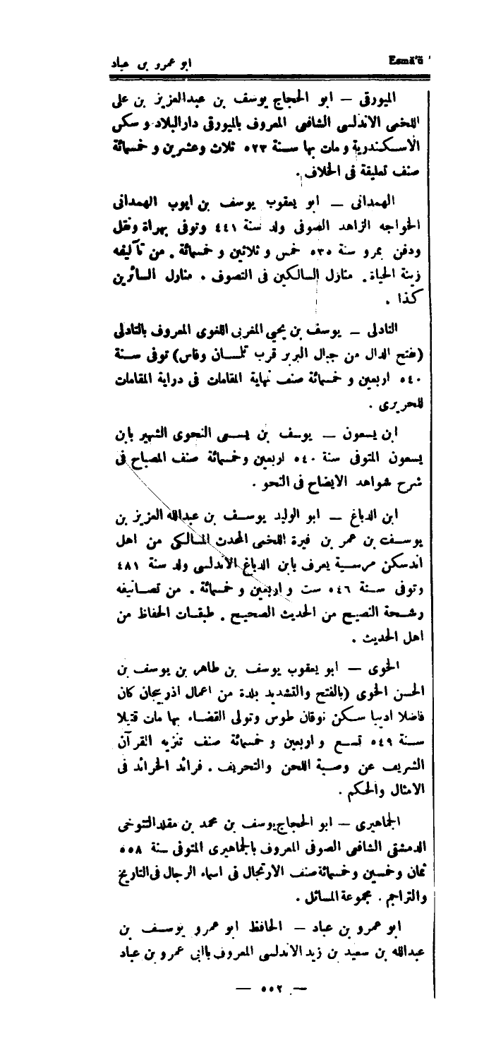 الْهَمدَانِي ابو يَعْقُوب يُوسُف بن ايوب الْهَمدَانِي الخواجه الزَّاهِد الصوفى ولد سنة 441 وَتوفى بهراة وَنقل وَدفن بمرو سنة 535 خمس وَثَلَاثِينَ وَخَمْسمِائة.