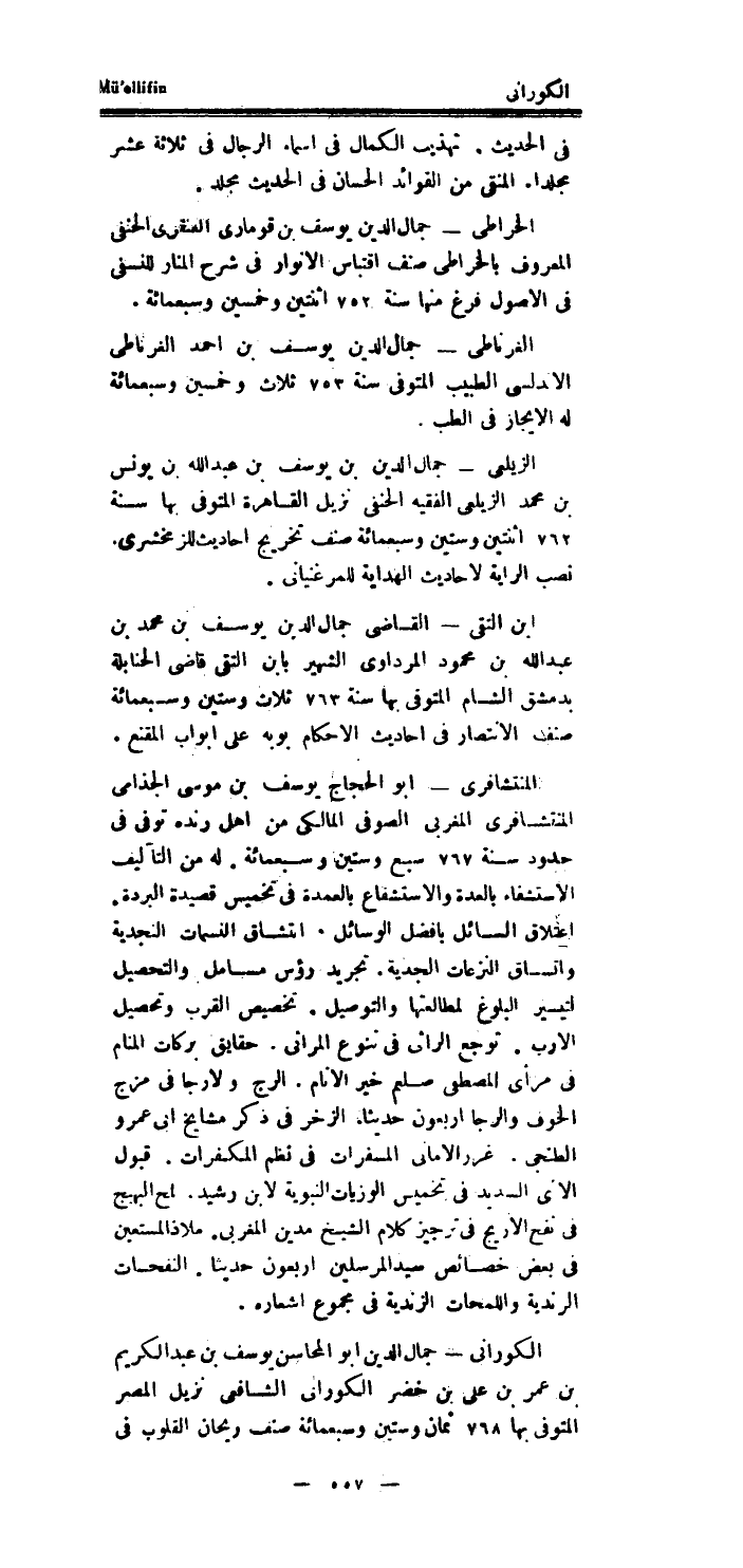 الكوراني جمال الدَّين أَبُو المحاسن يُوسُف بن عبد الْكَرِيم بن عمر بن على بن خضر الكوراني الشَّافِعِي نزيل الْمصر الْمُتَوفَّى بهَا 768 ثَمَان وَسِتِّينَ وَسَبْعمائة صنف ريحَان الْقُلُوب فِي
