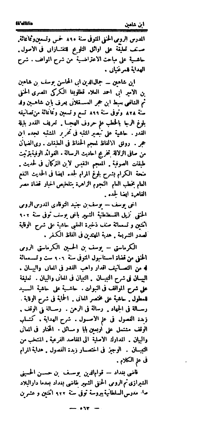 ابْن شاهين جمال الدَّين ابى المحاسن يُوسُف بن شاهين بن الامير ابى احْمَد الْعَلَاء قطلوبغا الكركي المصرى الْحَنَفِيّ ثمَّ الشَّافِعِي سبط ابْن حجر الْعَسْقَلَانِي يعرف بِابْن شاهين ولد سنة 828 وَتوفى سنة 899 تسع وَتِسْعين وَثَمَانمِائَة من تصانيقه بُلُوغ الرجا بالخطب علم حُرُوف الهجا.