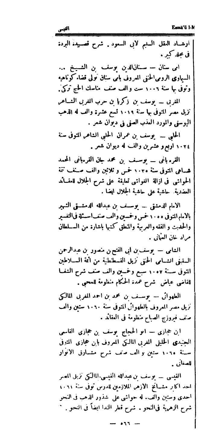 الشَّامي يُوسُف بن ابى الْفَتْح بن مَنْصُور بن عبد الرحمن السقيفى الشَّامي الْحَنَفِيّ نزيل القسطنطنية من ائمة السلاطين الْمُتَوفَّى سنة 1057 سبع وَخمسين والف صنف شرح الشفا للقاضى عِيَاض شرح عُمْدَة الْحُكَّام منظومة للمحبى.