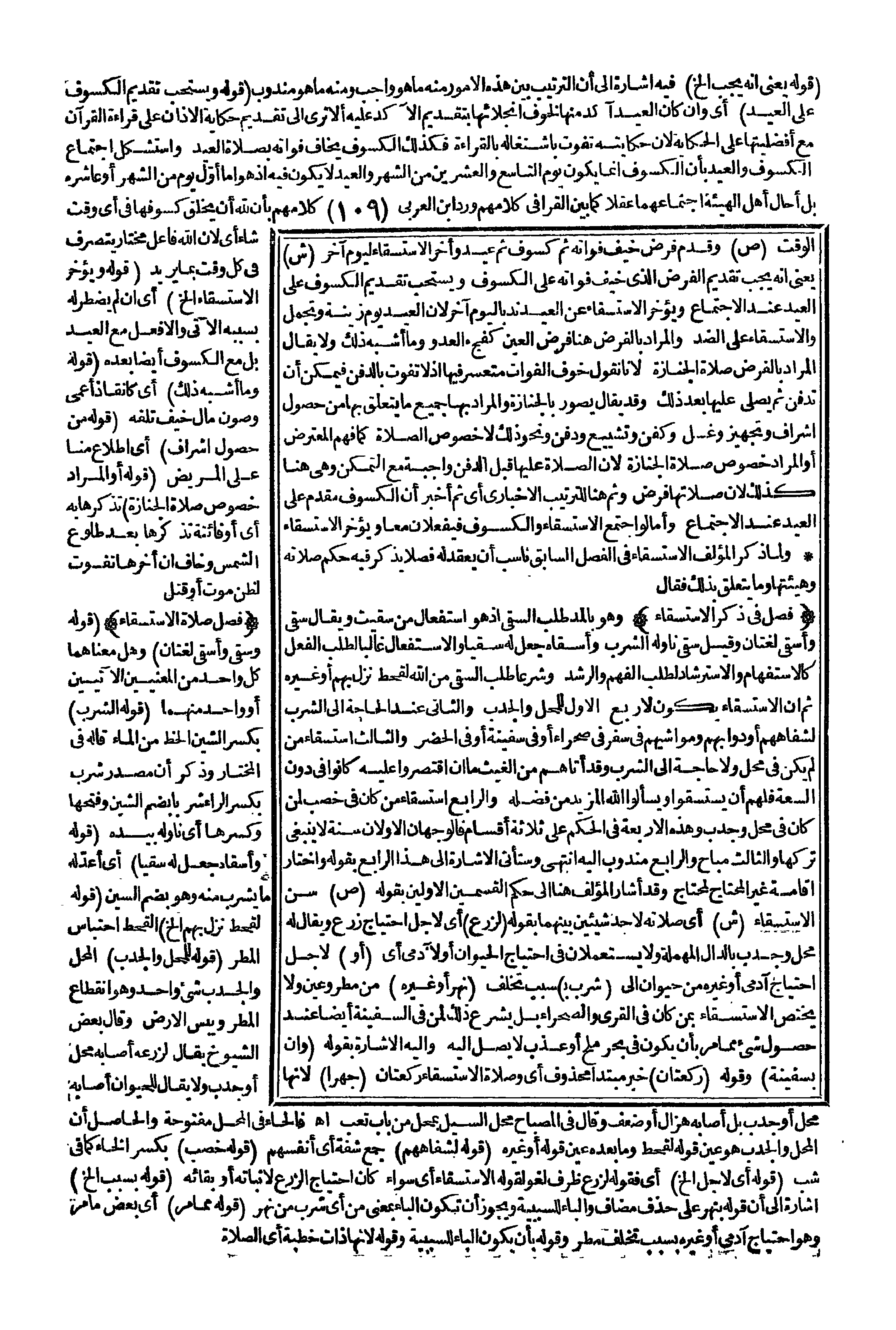 ـــــــــــــــــــــــــــــQقَوْلُهُ يَعْنِي أَنَّهُ يَجِبُ إلَخْ) فِيهِ إشَارَةٌ إلَى أَنَّ التَّرْتِيبَ بَيْنَ هَذِهِ الْأُمُورِ مِنْهُ مَا هُوَ وَاجِبٌ وَمِنْهُ مَا هُوَ مَنْدُوبٌ. (قَوْلُهُ وَيُسْتَحَبُّ تَقْدِيمُ الْكُسُوفِ عَلَى الْعِيدِ) أَيْ: وَإِنْ كَانَ الْعِيدُ آكَدَ مِنْهَا لِخَوْفِ انْجِلَائِهَا بِتَقْدِيمِ الْآكَدِ عَلَيْهِ، أَلَا تَرَى إلَى تَقْدِيمِ حِكَايَةِ الْأَذَانِ عَلَى قِرَاءَةِ الْقُرْآنِ مَعَ أَفْضَلِيَّتِهَا عَلَى الْحِكَايَةِ؛ لِأَنَّ حِكَايَتَهُ تَفُوتُ بِاشْتِغَالِهِ بِالْقِرَاءَةِ، فَكَذَلِكَ الْكُسُوفُ يُخَافُ فَوَاتُهُ بِصَلَاةِ الْعِيدِ. وَاسْتُشْكِلَ اجْتِمَاعُ الْكُسُوفِ وَالْعِيدِ بِأَنَّ الْكُسُوفَ إنَّمَا يَكُونُ يَوْمَ التَّاسِعِ وَالْعِشْرِينَ مِنْ الشَّهْرِ، وَالْعِيدَ لَا يَكُونُ فِيهِ، إذْ هُوَ إمَّا أَوَّلُ يَوْمٍ مِنْ الشَّهْرِ أَوْ عَاشِرُهُ، بَلْ أَحَالَ أَهْلُ الْهَيْئَةِ اجْتِمَاعَهُمَا عَقْلًا كَمَا بَيَّنَ الْقَرَافِيُّ كَلَامَهُمْ وَرَدَّ ابْنُ الْعَرَبِيِّ كَلَامَهُمْ، بِأَنَّ لِلَّهِ أَنْ يَخْلُقَ كُسُوفَهَا فِي أَيِّ وَقْتٍ شَاءَ أَيْ: لِأَنَّ اللَّهَ فَاعِلٌ مُخْتَارٌ يَتَصَرَّفُ فِي كُلِّ وَقْتٍ بِمَا يُرِيدُ. (قَوْلُهُ وَيُؤَخَّرُ الِاسْتِسْقَاءُ إلَخْ) أَيْ: إنْ لَمْ يُضْطَرَّ لَهُ بِسَبَبِهِ الْآتِي وَإِلَّا فُعِلَ مَعَ الْعِيدِ، بَلْ مَعَ الْكُسُوفِ أَيْضًا بَعْدَهُ (قَوْلُهُ وَمَا أَشْبَهَ ذَلِكَ) أَيْ: كَإِنْقَاذِ أَعْمَى وَصَوْنِ مَالٍ خِيفَ تَلَفُهُ (قَوْلُهُ مِنْ حُصُولِ إشْرَافٍ) أَيْ: اطِّلَاعٍ مِنَّا عَلَى الْمَرِيضِ. (قَوْلُهُ أَوْ الْمُرَادُ خُصُوصُ صَلَاةِ الْجِنَازَةِ) تَذَكَّرَهَا بِهِ أَيْ: أَوْ فَائِتَةٍ تَذَكَّرَهَا بَعْدَ طُلُوعِ الشَّمْسِ وَخَافَ إنْ أَخَّرَهَا تَفُوتُ لِظَنِّ مَوْتٍ أَوْ قَتْلٍ.