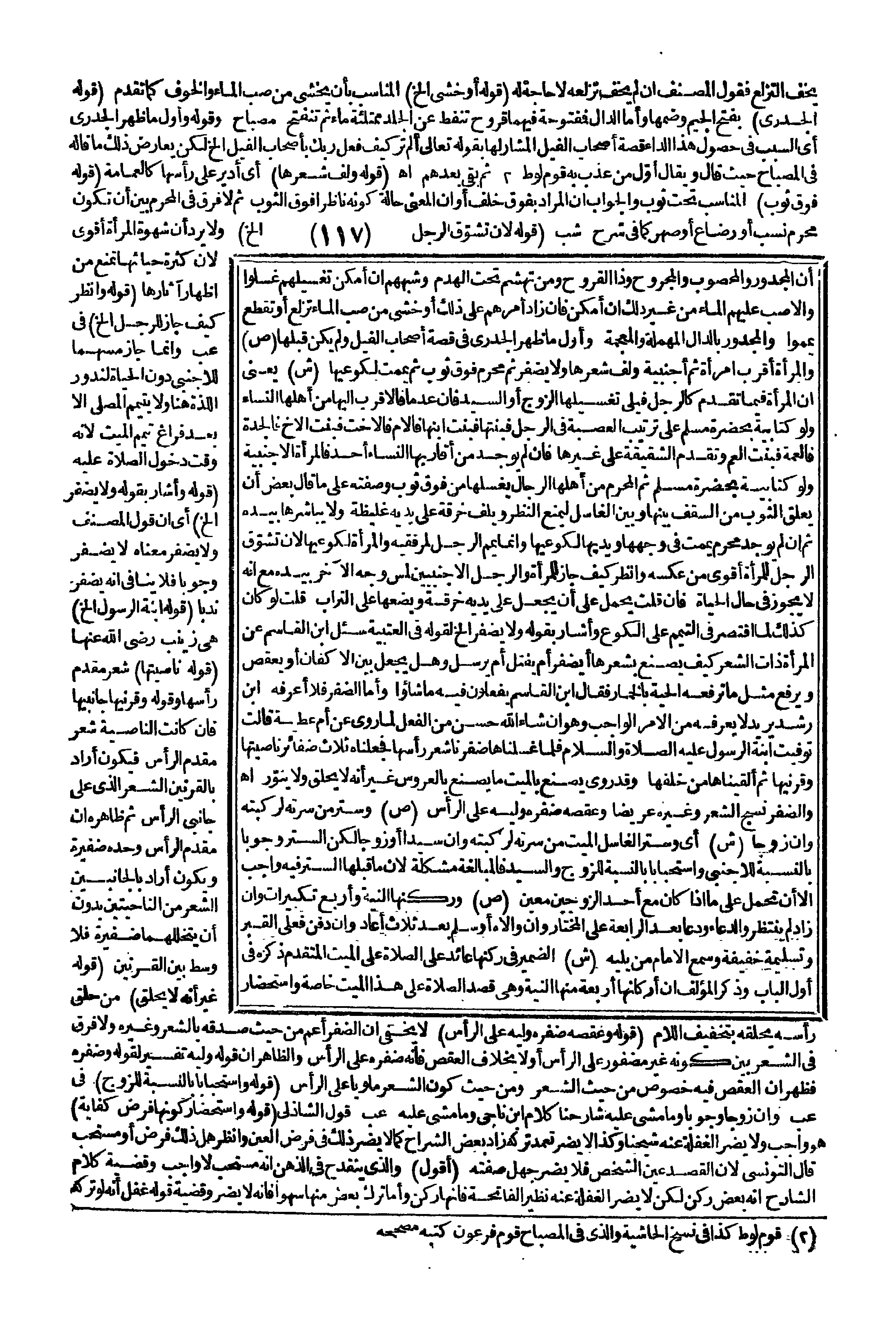 (قَوْلُهُ وَلُفَّ شَعْرُهَا) أَيْ: أُدِيرَ عَلَى رَأْسِهَا كَالْعِمَامَةِ. (قَوْلُهُ فَوْقَ ثَوْبٍ) الْمُنَاسِبُ: تَحْتَ ثَوْبٍ، وَالْجَوَابُ: أَنَّ الْمُرَادَ بِفَوْقَ، خَلْفَ أَوْ أَنَّ الْمَعْنَى حَالَةُ كَوْنِهِ نَاظِرًا فَوْقَ الثَّوْبِ، ثُمَّ لَا فَرْقَ فِي الْمَحْرَمِ بَيْنَ أَنْ تَكُونَ مَحْرَمَ نَسَبٍ أَوْ رَضَاعٍ أَوْ صِهْرٍ كَمَا فِي شَرْحِ شب. (قَوْلُهُ لِأَنَّ تَشَوُّقَ الرَّجُلِ. . . إلَخْ) وَلَا يَرِدُ أَنَّ شَهْوَةَ الْمَرْأَةِ أَقْوَى لِأَنَّ كَثْرَةَ حَيَائِهَا تَمْنَعُ مِنْ إظْهَارِ آثَارِهَا. (قَوْلُهُ وَانْظُرْ كَيْفَ جَازَ لِلرَّجُلِ. . . إلَخْ) فِي عب وَإِنَّمَا جَازَ مَسُّهُمَا لِلْأَجْنَبِيِّ دُونَ الْحَيَاةِ لِنُدُورِ اللَّذَّةِ هُنَا، وَلَا يَتَيَمَّمُ الْمُصَلِّي إلَّا بَعْدَ فَرَاغِ تَيَمُّمِ الْمَيِّتِ؛ لِأَنَّهُ وَقْتُ دُخُولِ الصَّلَاةِ عَلَيْهِ. (قَوْلُهُ وَأَشَارَ بِقَوْلِهِ وَلَا يُضَفَّرُ. . . إلَخْ) أَيْ أَنَّ قَوْلَ الْمُصَنِّفِ: وَلَا يُضَفَّرُ، مَعْنَاهُ لَا يُضَفَّرُ وُجُوبًا فَلَا يُنَافِي أَنَّهُ يُضَفَّرُ نَدْبًا. (قَوْلُهُ ابْنَةُ الرَّسُولِ. . . إلَخْ) هِيَ زَيْنَبُ - رَضِيَ اللَّهُ عَنْهَا -. (قَوْلُهُ نَاصِيَتَهَا) شَعْرُ مُقَدَّمِ رَأْسِهَا، وَقَوْلُهُ: وَقَرْنَيْهَا، جَانِبَيْهَا. فَإِنْ كَانَتْ النَّاصِيَةُ شَعْرَ مُقَدَّمِ الرَّأْسِ فَيَكُونُ أَرَادَ بِالْقَرْنَيْنِ الشَّعْرَ الَّذِي عَلَى جَانِبَيْ الرَّأْسِ، ثُمَّ ظَاهِرُهُ أَنَّ مُقَدَّمَ الرَّأْسِ وَحْدَهُ ضَفِيرَةٌ، وَيَكُونُ أَرَادَ بِالْجَانِبَيْنِ الشَّعْرَ مِنْ النَّاحِيَتَيْنِ بِدُونِ أَنْ يَتَخَلَّلَهُمَا ضَفِيرَةٌ فَلَا وَسَطَ بَيْنَ الْقَرْنَيْنِ. (قَوْلُهُ غَيْرَ أَنَّهُ لَا يُحْلَقُ) مِنْ حَلَقَ رَأْسَهُ يَحْلِقُهُ بِتَخْفِيفِ اللَّامِ. (قَوْلُهُ وَعَقْصُهُ ضَفْرُهُ وَلَيُّهُ عَلَى الرَّأْسِ) لَا يَخْفَى أَنَّ الضَّفْرَ أَعَمُّ مِنْ حَيْثُ صِدْقُهُ بِالشَّعْرِ وَغَيْرِهِ، وَلَا فَرْقَ فِي الشَّعْرِ بَيْنَ كَوْنِهِ غَيْرَ مَضْفُورٍ عَلَى الرَّأْسِ أَوْ لَا بِخِلَافِ الْعَقْصِ فَإِنَّهُ ضَفْرُهُ عَلَى الرَّأْسِ. وَالظَّاهِرُ أَنَّ قَوْلَهُ: وَلَيُّهُ، تَفْسِيرٌ لِقَوْلِهِ: ضَفْرُهُ، فَظَهَرَ أَنَّ الْعَقْصَ فِيهِ خُصُوصٌ مِنْ حَيْثُ الشَّعْرُ وَمِنْ حَيْثُ كَوْنُ الشَّعْرِ مَلْوِيًّا عَلَى الرَّأْسِ (قَوْلُهُ وَاسْتِحْبَابًا بِالنِّسْبَةِ لِلزَّوْجِ) فِي عب وَإِنْ زَوْجًا وُجُوبًا، وَمَا مَشَى عَلَيْهِ شَارِحُنَا كَلَامُ ابْنِ نَاجِي، وَمَا مَشَى عَلَيْهِ عب قَوْلُ الشَّاذِلِيِّ.
