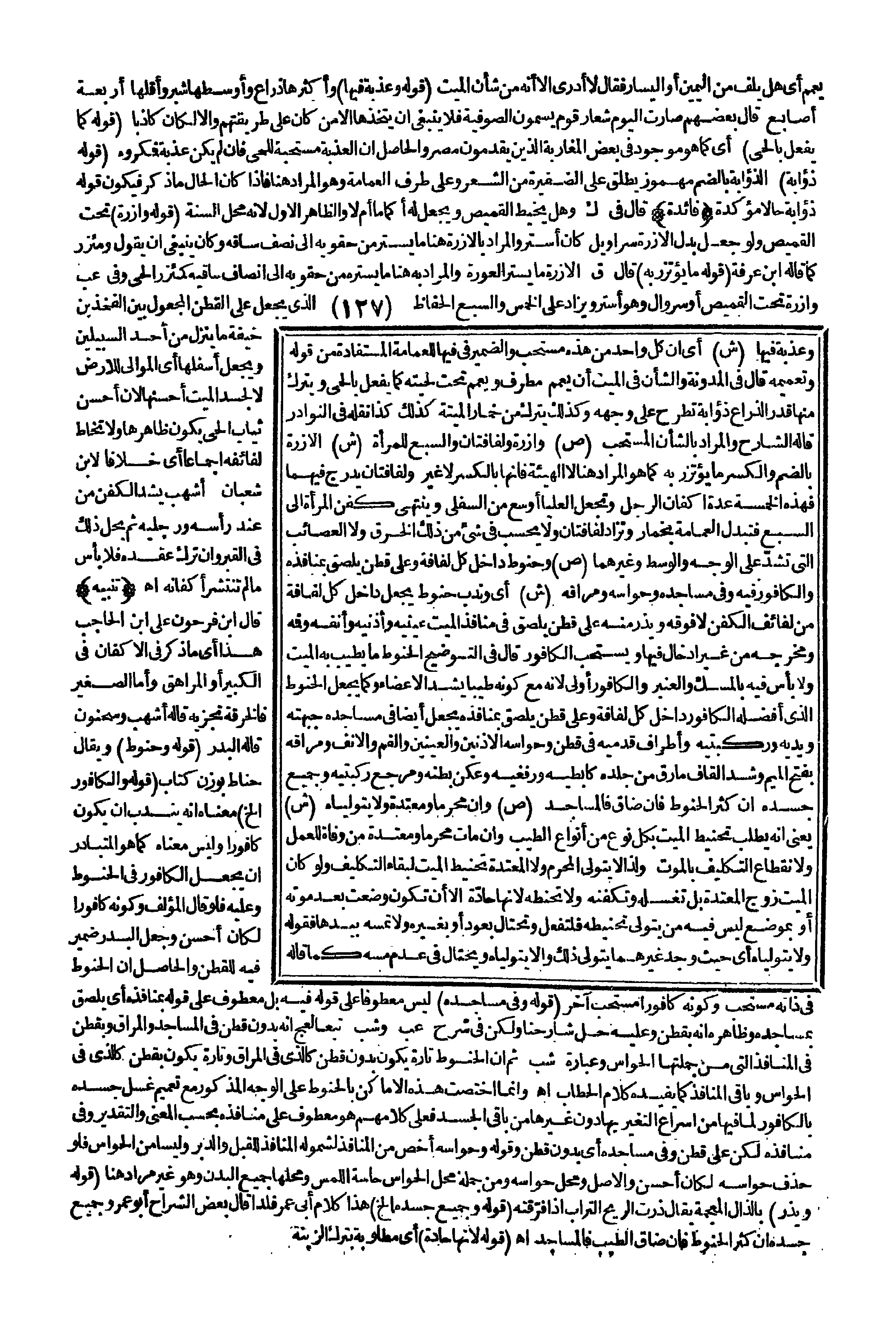 (تَنْبِيهٌ) : قَالَ ابْنُ فَرْحُونٍ عَلَى ابْنِ الْحَاجِبِ: هَذَا أَيْ: مَا ذُكِرَ فِي الْأَكْفَانِ فِي الْكَبِيرِ أَوْ الْمُرَاهِقِ، وَأَمَّا الصَّغِيرُ فَالْخِرْقَةُ تُجْزِيهِ قَالَهُ أَشْهَبُ وَسَحْنُونٌ قَالَهُ الْبَدْرُ. (قَوْلُهُ وَحَنُوطٌ) وَيُقَالُ: حِنَاطٌ بِوَزْنِ كِتَابٍ. (قَوْلُهُ وَالْكَافُورُ. . . إلَخْ) مَعْنَاهُ أَنَّهُ يُنْدَبُ أَنْ يَكُونَ كَافُورًا وَلَيْسَ مَعْنَاهُ كَمَا هُوَ الْمُتَبَادَرُ أَنْ يُجْعَلَ الْكَافُورُ فِي الْحَنُوطِ. وَعَلَيْهِ فَلَوْ قَالَ الْمُؤَلِّفُ: وَكَوْنُهُ كَافُورًا لَكَانَ أَحْسَنَ وَجَعَلَ الْبَدْرُ ضَمِيرَ فِيهِ لِلْقُطْنِ، وَالْحَاصِلُ أَنَّ الْحَنُوطَ فِي ذَاتِهِ مُسْتَحَبٌّ وَكَوْنُهُ كَافُورًا مُسْتَحَبٌّ آخَرُ. (قَوْلُهُ وَفِي مَسَاجِدِهِ) لَيْسَ مَعْطُوفًا عَلَى قَوْلِهِ: فِيهِ، بَلْ مَعْطُوفٌ عَلَى قَوْلِهِ: بِمَنَافِذِهِ أَيْ: يُلْصَقُ بِمَسَاجِدِهِ، وَظَاهِرُهُ أَنَّهُ بِقُطْنٍ، وَعَلَيْهِ حِلُّ شَارِحِنَا وَلَكِنْ فِي شَرْحِ عب وَشُبْ تَبَعًا لِعَجِّ أَنَّهُ بِدُونِ قُطْنٍ فِي الْمَسَاجِدِ وَالْمَرَاقِّ، وَبِقُطْنٍ فِي الْمَنَافِذِ الَّتِي مِنْ جُمْلَتِهَا الْحَوَاسُّ. وَعِبَارَةُ شب ثُمَّ إنَّ الْحَنُوطَ تَارَةً يَكُونُ بِدُونِ قُطْنٍ كَاَلَّذِي فِي الْمَرَاقِّ وَتَارَةً يَكُونُ بِقُطْنٍ كَاَلَّذِي فِي الْحَوَاسِّ وَبَاقِي الْمَنَافِذِ. كَمَا يُفِيدُهُ كَلَامُ الْحَطَّابِ اهـ.