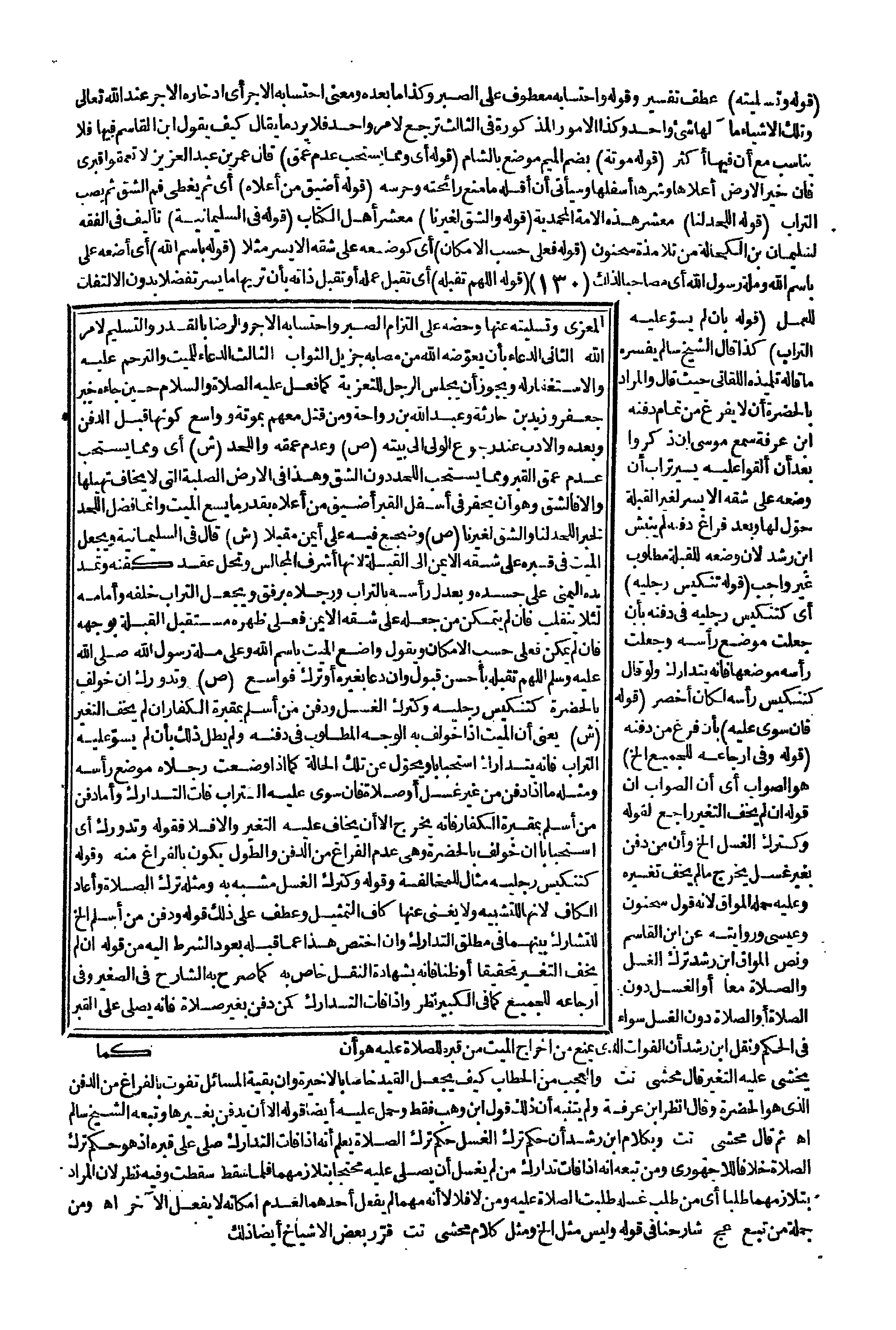 وَنَقَلَ ابْنُ رُشْدٍ أَنَّ الْفَوَاتَ الَّذِي يَمْنَعُ مِنْ إخْرَاجِ الْمَيِّتِ مِنْ قَبْرِهِ لِلصَّلَاةِ عَلَيْهِ هُوَ أَنْ يُخْشَى عَلَيْهِ التَّغَيُّرُ قَالَ مُحَشِّي تت: وَالْعَجَبُ مِنْ الْحَطَّابِ كَيْفَ يَجْعَلُ الْقَيْدَ خَاصًّا بِالْأَخِيرَةِ وَأَنَّ بَقِيَّةَ الْمَسَائِلِ تَفُوتُ بِالْفَرَاغِ مِنْ الدَّفْنِ الَّذِي هُوَ الْحَضْرَةُ؟ وَقَالَ: اُنْظُرْ ابْنَ عَرَفَةَ وَلَمْ يَتَنَبَّهْ أَنَّ ذَلِكَ قَوْلُ ابْنِ وَهْبٍ فَقَطْ، وَحَمَلَ عَلَيْهِ أَيْضًا قَوْلَهُ: إلَّا أَنْ يُدْفَنَ بِغَيْرِهَا وَتَبِعَهُ الشَّيْخُ سَالِمٌ اهـ. ثُمَّ قَالَ مُحَشِّي تت: وَبِكَلَامِ ابْنِ رُشْدٍ أَنَّ حُكْمَ تَرْكِ الْغُسْلِ حُكْمُ تَرْكِ الصَّلَاةِ يُعْلَمُ أَنَّهُ إذَا فَاتَ التَّدَارُكُ صُلِّيَ عَلَى قَبْرِهِ إذْ هُوَ حُكْمُ تَرْكِ الصَّلَاةِ خِلَافًا لِلْأُجْهُورِيِّ وَمَنْ تَبِعَهُ أَنَّهُ إذَا فَاتَ تَدَارُكُ مَنْ لَمْ يُغَسَّلْ أَنْ يُصَلَّى عَلَيْهِ مُحْتَجًّا بِتَلَازُمِهِمَا فَلَمَّا سَقَطَ سَقَطَتْ وَفِيهِ نَظَرٌ؛ لِأَنَّ الْمُرَادَ بِتَلَازُمِهِمَا طَلَبًا أَيْ: مَنْ طُلِبَ غُسْلُهُ طُلِبَتْ الصَّلَاةُ عَلَيْهِ وَمَنْ لَا فَلَا لَا أَنَّهُ مَهْمَا لَمْ يُفْعَلْ أَحَدُهُمَا لِعَدَمِ إمْكَانِهِ لَا يُفْعَلُ الْآخَرُ اهـ.
