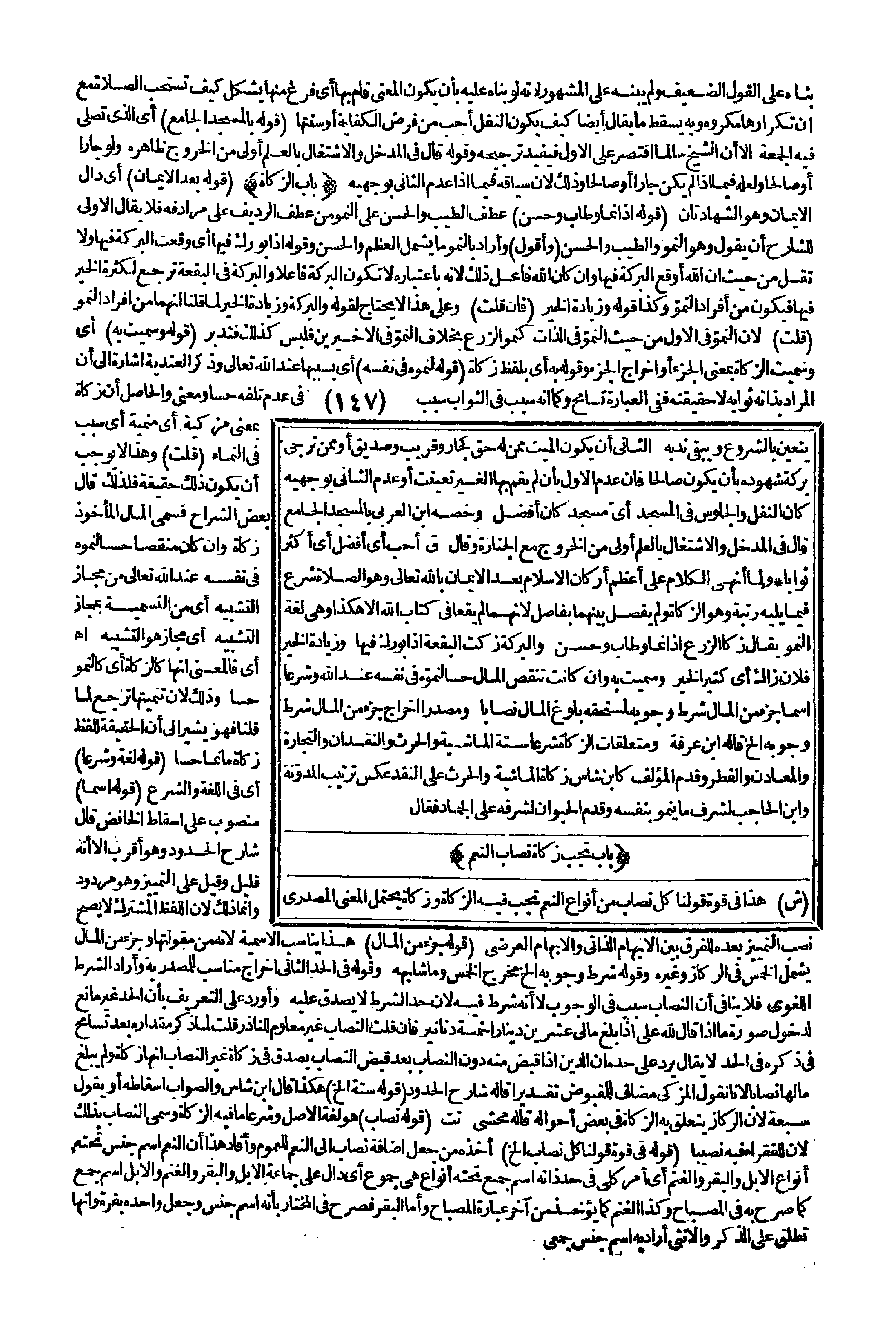 وَلَمَّا أَنْهَى الْكَلَامَ عَلَى أَعْظَمِ أَرْكَانِ الْإِسْلَامِ بَعْدَ الْإِيمَانِ بِاَللَّهِ تَعَالَى وَهُوَ الصَّلَاةُ شَرَعَ فِيمَا يَلِيهِ رُتْبَةً، وَهُوَ الزَّكَاةُ وَلَمْ يَفْصِلْ بَيْنَهُمَا بِفَاصِلٍ لِأَنَّهُمَا لَمْ يَقَعَا فِي كِتَابِ اللَّهِ إلَّا هَكَذَا وَهِيَ لُغَةً النُّمُوُّ يُقَالُ: زَكَا الزَّرْعُ إذَا نَمَا وَطَابَ وَحَسُنَ وَالْبَرَكَةُ زَكَتْ الْبُقْعَةُ إذَا بُورِكَ فِيهَا وَزِيَادَةُ الْخَيْرِ فُلَانٌ زَاكٍ أَيْ كَثِيرُ الْخَيْرِ وَسُمِّيَتْ بِهِ، وَإِنْ كَانَتْ تُنْقِصُ الْمَالَ حِسًّا لِنُمُوِّهِ فِي نَفْسِهِ عِنْدَ اللَّهِ، وَشَرْعًا اسْمًا جُزْءٌ مِنْ الْمَالِ شَرْطُ وُجُوبِهِ لِمُسْتَحِقِّهِ بُلُوغُ الْمَالِ نِصَابًا، وَمَصْدَرًا إخْرَاجُ جُزْءٍ مِنْ الْمَالِ شَرْطُ وُجُوبِهِ. . . إلَخْ قَالَهُ ابْنُ عَرَفَةَ وَمُتَعَلِّقَاتُ الزَّكَاةِ شَرْعًا سِتَّةٌ الْمَاشِيَةُ وَالْحَرْثُ وَالنَّقْدَانِ وَالتِّجَارَةُ وَالْمَعَادِنُ وَالْفِطْرُ وَقَدَّمَ الْمُؤَلِّفُ كَابْنِ شَاسٍ زَكَاةَ الْمَاشِيَةِ وَالْحَرْثِ عَلَى النَّقْدِ عَكْسَ تَرْتِيبِ الْمُدَوَّنَةِ وَابْنِ الْحَاجِبِ لِشَرَفِ مَا يَنْمُو بِنَفْسِهِ وَقَدَّمَ الْحَيَوَانَ لِشَرَفِهِ عَلَى الْجَمَادِ فَقَالَ (بَابٌ تَجِبُ زَكَاةُ نِصَابِ النَّعَمِ) (ش) هَذَا فِي قُوَّةِ قَوْلِنَا: كُلُّ نِصَابٍ مِنْ أَنْوَاعِ النَّعَمِ تَجِبُ فِيهِ الزَّكَاةُ وَزَكَاةُ يَحْتَمِلُ الْمَعْنَى الْمَصْدَرِيَّ.