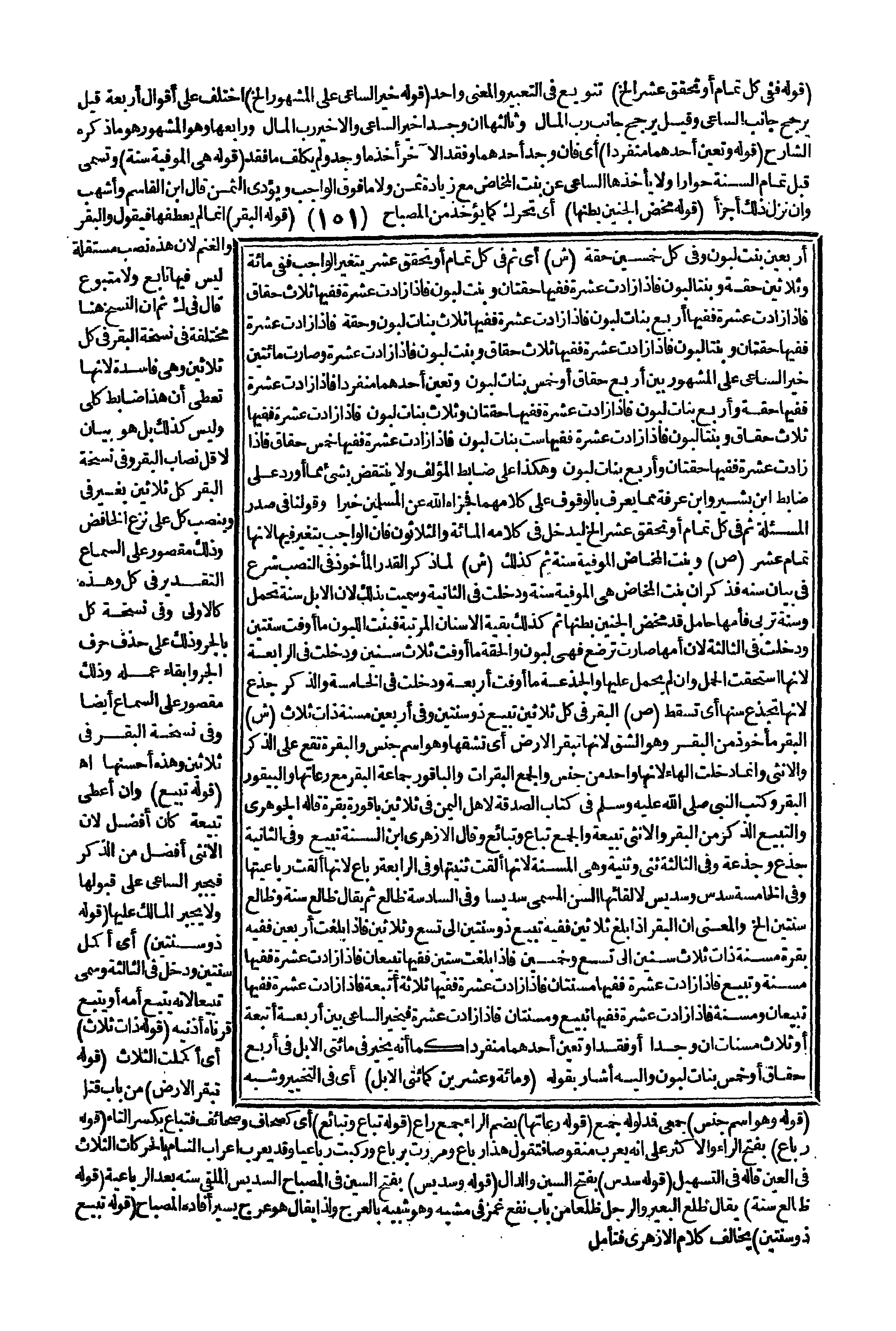 (قَوْلُهُ تَبْقُرُ الْأَرْضَ) مِنْ بَابِ قَتَلَ (قَوْلُهُ: وَهُوَ اسْمُ جِنْسٍ) جَمْعِيٍّ فَمَدْلُولُهُ جَمْعٌ (قَوْلُهُ: رُعَاتُهَا) بِضَمِّ الرَّاءِ جَمْعُ رَاعٍ. (قَوْلُهُ: تِبَاعٌ وَتَبَائِعُ) أَيْ كَصِحَافٍ وَصَحَائِفَ فَتِبَاعٌ بِكَسْرِ التَّاءِ (قَوْلُهُ: رَبَاعٌ) بِفَتْحِ الرَّاءِ وَالْأَكْثَرُ عَلَى أَنَّهُ يُعْرَبُ مَنْقُوصًا فَتَقُولُ هَذَا رَبَاعٌ وَمَرَرْت بِرَبَاعٍ وَرَكِبْت رُبَاعِيًّا وَقَدْ يُعْرَبُ إعْرَابَ التَّامِّ بِالْحَرَكَاتِ الثَّلَاثِ فِي الْعَيْنِ قَالَهُ فِي التَّسْهِيلِ. (قَوْلُهُ: سَدَسَ) بِفَتْحِ السِّينِ وَالدَّالِ. (قَوْلُهُ وَسَدِيسٌ) بِفَتْحِ السِّينِ فِي الْمِصْبَاحِ السَّدِيسُ الْمُلْقِي سِنَّهُ بَعْدَ الرَّبَاعِيَةِ (قَوْلُهُ: ظَالِعُ سَنَةٍ) يُقَالُ ظَلَعَ الْبَعِيرُ وَالرَّجُلُ ظَلْعًا مِنْ بَابِ نَفَعَ غَمَزَ فِي مَشْيِهِ وَهُوَ شَبِيهٌ بِالْعَرَجِ وَلِذَا يُقَالُ هُوَ عَرَجٌ يَسِيرٌ أَفَادَهُ الْمِصْبَاحُ. (قَوْلُهُ: تَبِيعٌ ذُو سَنَتَيْنِ) يُخَالِفُ كَلَامَ الْأَزْهَرِيِّ فَتَأَمَّلْ