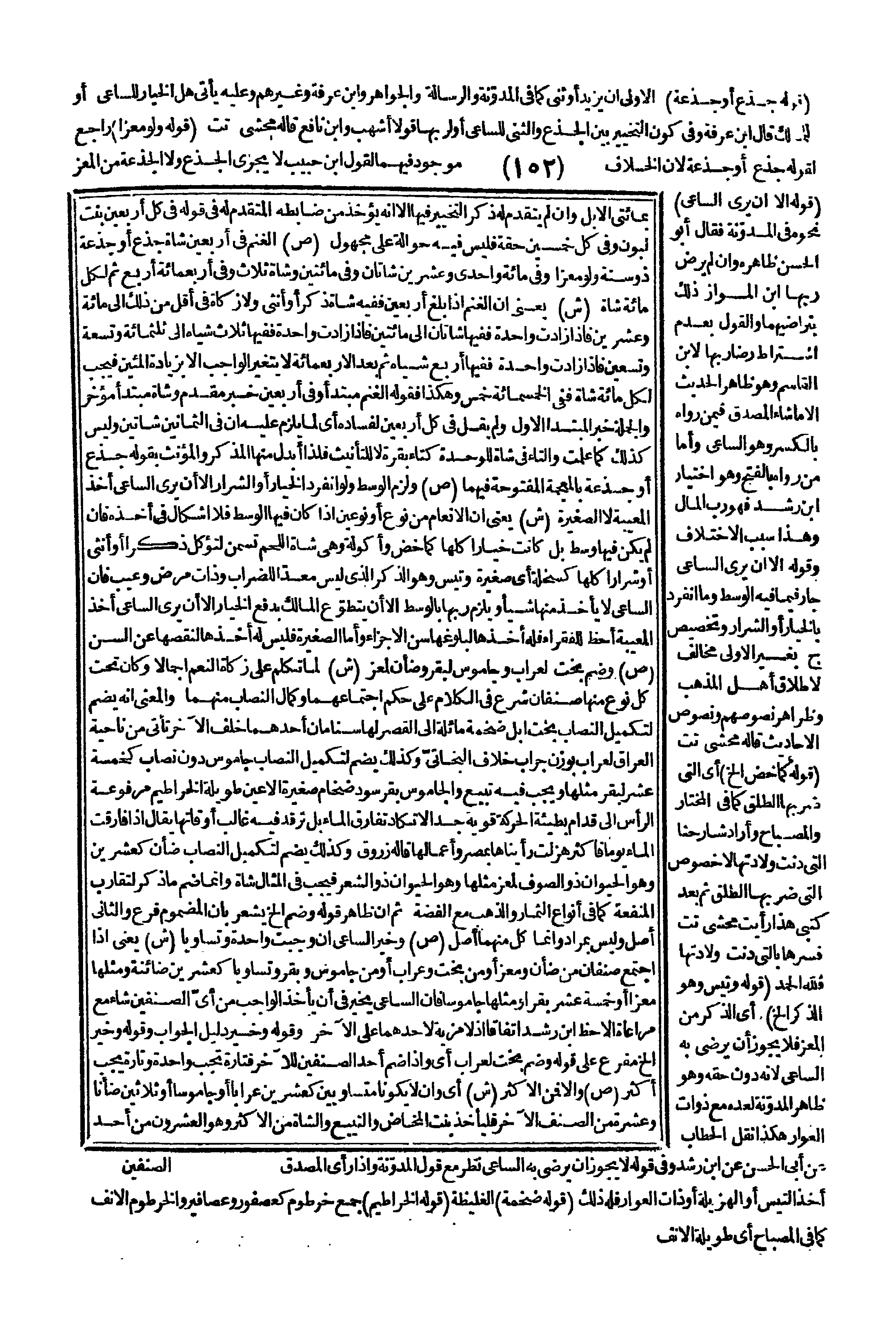 (ص) وَخُيِّرَ السَّاعِي إنْ وَجَبَتْ وَاحِدَةٌ وَتَسَاوَيَا (ش) يَعْنِي إذَا اجْتَمَعَ صِنْفَانِ مِنْ ضَأْنٍ وَمَعْزٍ، أَوْ مِنْ بُخْتٍ وَعِرَابٍ، أَوْ مِنْ جَامُوسٍ وَبَقَرٍ وَتَسَاوَيَا كَعِشْرِينَ ضَائِنَةً وَمِثْلِهَا مَعْزًا، أَوْ خَمْسَةَ عَشَرَ بَقَرًا وَمِثْلِهَا جَامُوسًا فَإِنَّ السَّاعِيَ يُخَيَّرُ فِي أَنْ يَأْخُذَ الْوَاجِبَ مِنْ أَيِّ الصِّنْفَيْنِ شَاءَ مَعَ مُرَاعَاةِ الْأَحَظِّ ابْنُ رُشْدٍ اتِّفَاقًا إذْ لَا مَزِيَّةَ لِأَحَدِهِمَا عَلَى الْآخَرِ وَقَوْلُهُ: وَخُيِّرَ دَلِيلُ الْجَوَابِ وَقَوْلُهُ: وَخُيِّرَ. . . إلَخْ مُفَرَّعٌ عَلَى قَوْلِهِ: وَضُمَّ بُخْتٌ لِعِرَابٍ أَيْ وَإِذَا ضُمَّ أَحَدُ الصِّنْفَيْنِ لِلْآخَرِ فَتَارَةً تَجِبُ وَاحِدَةٌ وَتَارَةً يَجِبُ أَكْثَرُ. (ص) وَإِلَّا فَمِنْ الْأَكْثَرِ (ش) أَيْ وَأَنْ لَا يَكُونَا مُتَسَاوِيَيْنِ كَعِشْرِينَ عِرَابًا أَوْ جَامُوسًا، أَوْ ثَلَاثِينَ ضَأْنًا وَعَشَرَةٍ مِنْ الصِّنْفِ الْآخَرِ فَلْيَأْخُذْ بِنْتَ الْمَخَاضِ وَالتَّبِيعَ وَالشَّاةَ مِنْ الْأَكْثَرَ، وَهُوَ الْعِشْرُونَ مِنْ أَحَدِ