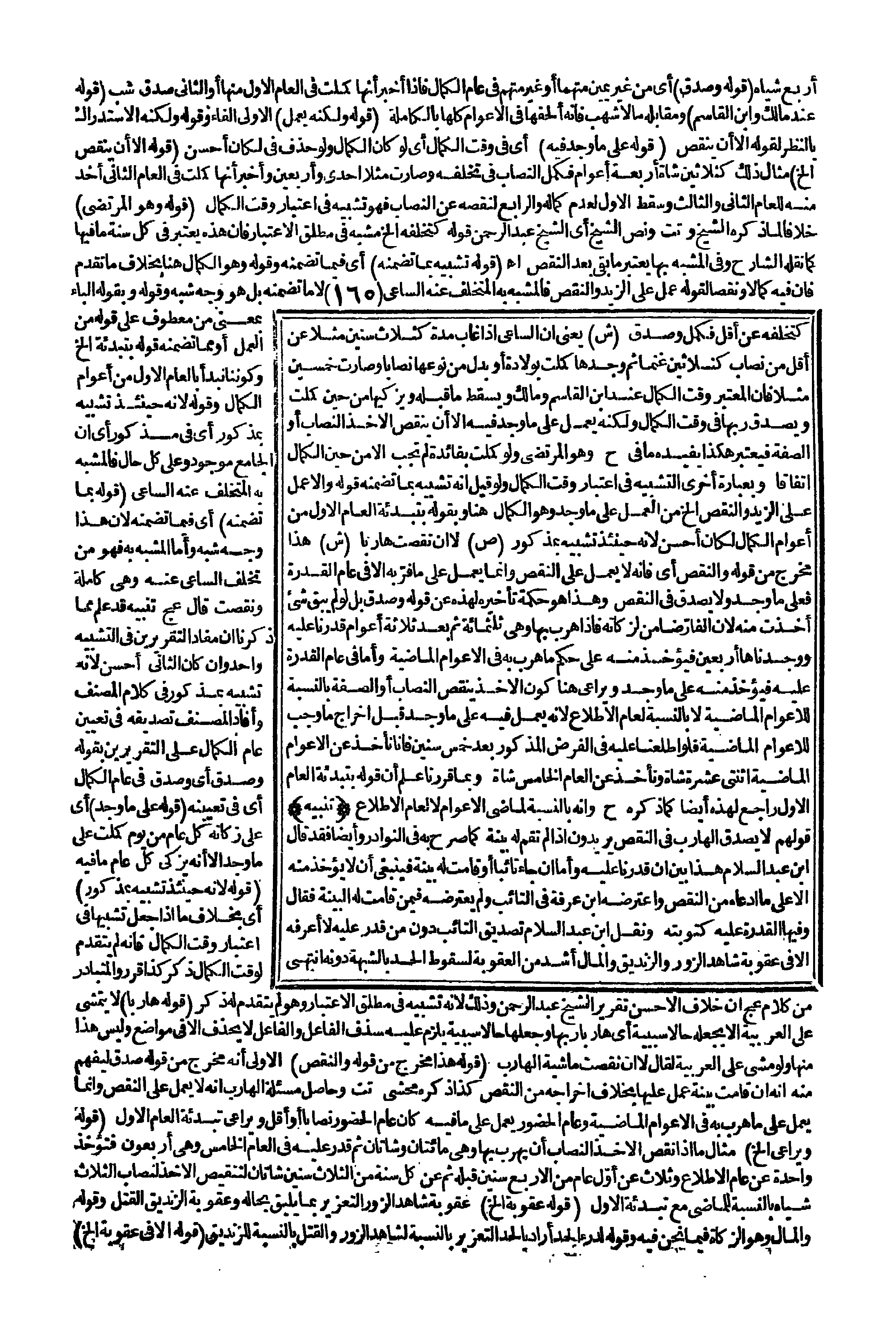 (قَوْلُهُ: لِأَنَّهُ حِينَئِذٍ تَشْبِيهٌ بِمَذْكُورٍ) أَيْ بِخِلَافِ مَا إذَا جُعِلَ تَشْبِيهًا فِي اعْتِبَارِ وَقْتِ الْكَمَالِ فَإِنَّهُ لَمْ يَتَقَدَّمْ لِوَقْتِ الْكَمَالِ ذِكْرٌ كَذَا قُرِّرَ وَالْمُتَبَادَرُ مِنْ كَلَامِ عج أَنَّ خِلَافَ الْأَحْسَنِ تَقْرِيرُ الشَّيْخِ عَبْدِ الرَّحْمَنِ وَذَلِكَ لِأَنَّهُ تَشْبِيهٌ فِي مُطْلَقِ الِاعْتِبَارِ، وَهُوَ لَمْ يَتَقَدَّمْ لَهُ ذِكْرٌ. (قَوْلُهُ: هَارِبًا) لَا يَتَمَشَّى عَلَى الْعَرَبِيَّةِ إلَّا بِجَعْلِهِ حَالًا سَبَبِيَّةً أَيْ هَارِبًا وَجَعْلُهَا حَالًا سَبَبِيَّةً يَلْزَمُ عَلَيْهِ حَذْفُ الْفَاعِلِ وَالْفَاعِلُ لَا يُحْذَفُ إلَّا فِي مَوَاضِعَ وَلَيْسَ هَذَا مِنْهَا وَلَوْ مَشَى عَلَى الْعَرَبِيَّةِ لَقَالَ لَا إنْ نَقَصَتْ مَاشِيَةُ الْهَارِبِ (قَوْلُهُ: هَذَا مُخَرَّجٌ مِنْ قَوْلِهِ وَالنَّقْصُ) الْأَوْلَى أَنَّهُ مُخَرَّجٌ مِنْ قَوْلِهِ: صُدِّقَ لِيُفْهَمَ مِنْهُ أَنَّهُ إنْ قَامَتْ بَيِّنَةٌ عَمِلَ عَلَيْهَا بِخِلَافِ إخْرَاجِهِ مِنْ النَّقْصِ كَذَا ذَكَرَهُ مُحَشِّي تت وَحَاصِلُ مَسْأَلَةِ الْهَارِبِ أَنَّهُ لَا يَعْمَلُ عَلَى النَّقْصِ وَإِنَّمَا يَعْمَلُ عَلَى مَا هَرَبَ بِهِ فِي الْأَعْوَامِ الْمَاضِيَةِ وَعَامِ الْحُضُورِ يَعْمَلُ عَلَى مَا فِيهِ كَانَ عَامَ الْحُضُورِ نِصَابًا أَوْ أَقَلَّ وَيُرَاعَى تَبْدِئَةُ الْعَامِ الْأَوَّلِ. (قَوْلُهُ: وَيُرَاعَى إلَخْ) مِثَالُ مَا إذَا نَقَصَ الْأَخْذُ النِّصَابَ أَنْ يَهْرُبَ بِهَا وَهِيَ مِائَتَانِ وَشَاتَانِ ثُمَّ قُدِرَ عَلَيْهِ فِي الْعَامِ الْخَامِسِ وَهِيَ أَرْبَعُونَ فَتُؤْخَذُ وَاحِدَةٌ عَنْ عَامِ الِاطِّلَاعِ وَثَلَاثٌ عَنْ أَوَّلِ عَامٍ مِنْ الْأَرْبَعِ سِنِينَ قَبْلَهُ ثُمَّ عَنْ كُلِّ سَنَةٍ مِنْ الثَّلَاثِ سِنِينَ شَاتَانِ لِتَنْقِيصِ الْأَخْذِ لِنِصَابِ الثَّلَاثِ شِيَاهٍ بِالنِّسْبَةِ لِلْمَاضِي مَعَ تَبْدِئَةِ الْأَوَّلِ. (قَوْلُهُ عُقُوبَةٍ. . . إلَخْ) عُقُوبَةُ شَاهِدِ الزُّورِ وَالتَّعْزِيرُ بِمَا يَلِيقُ بِحَالِهِ وَعُقُوبَةُ الزِّنْدِيقِ الْقَتْلُ وَقَوْلُهُ: وَالْمَالُ وَهُوَ الزَّكَاةُ فِيمَا نَحْنُ فِيهِ وَقَوْلُهُ: لِدَرْءِ الْحَدِّ أَرَادَ بِالْحَدِّ التَّعْزِيرَ بِالنِّسْبَةِ لِشَاهِدِ الزُّورِ وَالْقَتْلَ بِالنِّسْبَةِ لِلزِّنْدِيقِ. (قَوْلُهُ إلَّا فِي عُقُوبَةٍ. . . إلَخْ)