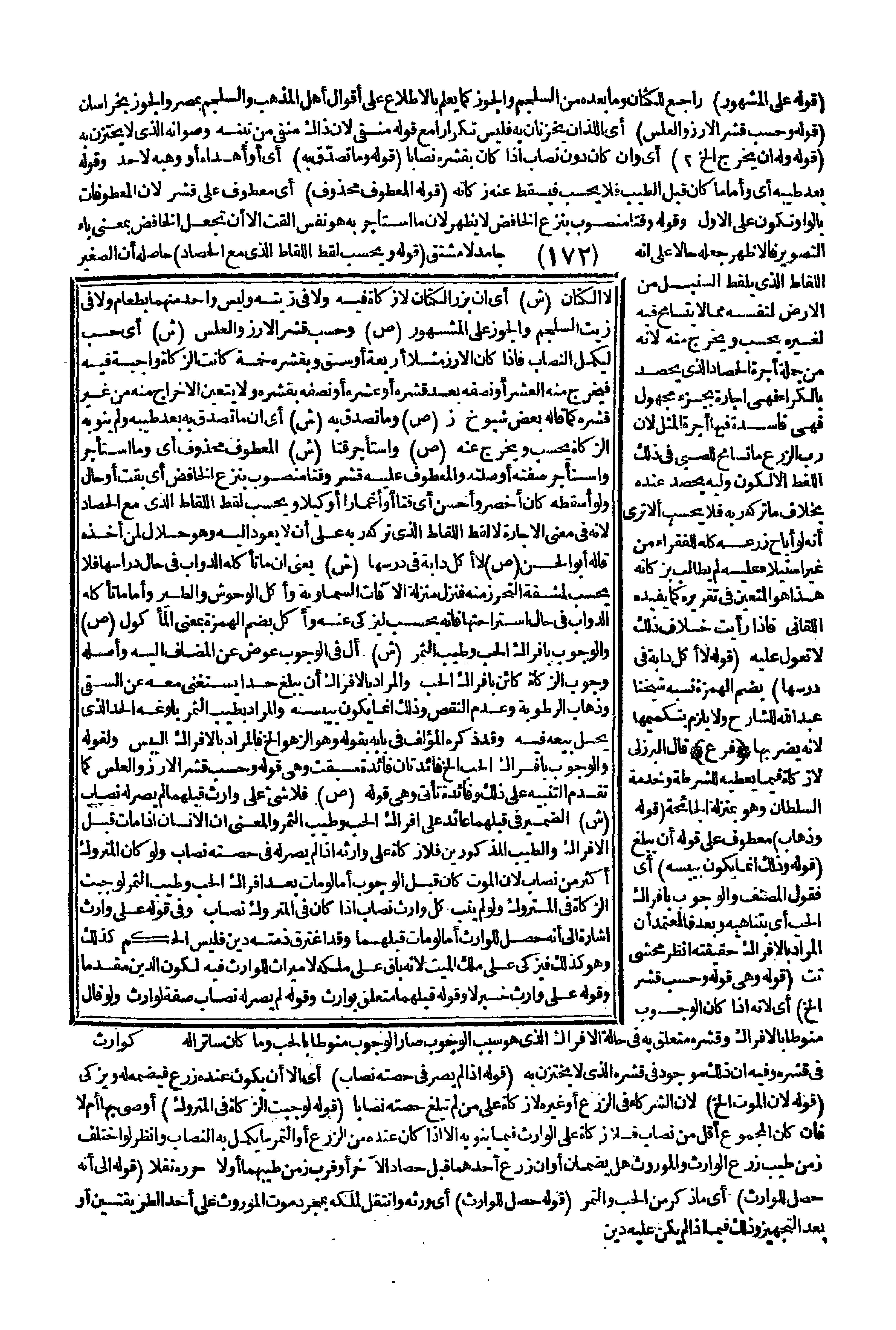 . (فَرْعٌ) قَالَ الْبُرْزُلِيُّ لَا زَكَاةَ فِيمَا يُعْطِيهِ لِلشُّرْطَةِ وَخَدَمَةِ السُّلْطَانِ وَهُوَ بِمَنْزِلَةِ الْجَائِحَةِ. (قَوْلُهُ وَذَهَابُ) مَعْطُوفٌ عَلَى قَوْلِهِ أَنْ يَبْلُغَ. (قَوْلُهُ: وَذَلِكَ إنَّمَا يَكُونُ بِيُبْسِهِ) أَيْ فَقَوْلُ الْمُصَنِّفِ وَالْوُجُوبُ بِإِفْرَاكِ الْحَبِّ أَيْ بِتَنَاهِيهِ وَبَعْدَهُ فَالْمُعْتَمَدُ أَنَّ الْمُرَادَ بِالْإِفْرَاكِ حَقِيقَتُهُ اُنْظُرْ مُحَشِّي تت. (قَوْلُهُ: وَهِيَ قَوْلُهُ: وَحُسِبَ قِشْرٌ. . . إلَخْ) أَيْ لِأَنَّهُ إذَا كَانَ الْوُجُوبُ مَنُوطًا بِالْإِفْرَاكِ وَقِشْرُهُ مُتَعَلِّقٌ بِهِ فِي حَالَةِ الْإِفْرَاكِ الَّذِي هُوَ سَبَبُ الْوُجُوبِ صَارَ الْوُجُوبُ مَنُوطًا بِالْحَبِّ وَمَا كَانَ سَاتِرًا لَهُ فِي قِشْرِهِ وَفِيهِ أَنَّ ذَلِكَ مَوْجُودٌ فِي قِشْرِهِ الَّذِي لَا يُخْتَزَنُ بِهِ. (قَوْلُهُ: إذَا لَمْ يَصِرْ فِي حِصَّتِهِ نِصَابٌ) أَيْ إلَّا أَنْ يَكُونَ عِنْدَهُ زَرْعٌ فَيَضُمَّهُ لَهُ وَيُزَكَّى. (قَوْلُهُ؛ لِأَنَّ الْمَوْتَ. . . إلَخْ) لِأَنَّ الشُّرَكَاءَ فِي الزَّرْعِ أَوْ غَيْرِهِ لَا زَكَاةَ عَلَى مَنْ لَمْ تَبْلُغْ حِصَّتُهُ نِصَابًا. (قَوْلُهُ لَوَجَبَتْ الزَّكَاةُ فِي الْمَتْرُوكِ) أَوْصَى بِهَا أَمْ لَا فَإِنْ كَانَ الْمَجْمُوعُ أَقَلَّ مِنْ نِصَابٍ فَلَا زَكَاةَ عَلَى الْوَارِثِ فِيمَا يَنُوبُهُ إلَّا إذَا كَانَ عِنْدَهُ مِنْ الزَّرْعِ، أَوْ التَّمْرِ مَا يُكْمِلُ بِهِ النِّصَابَ وَانْظُرْ لَوْ اخْتَلَفَ زَمَنُ طِيبِ زَرْعِ الْوَارِثِ وَالْمَوْرُوثِ هَلْ يُضَمَّانِ، أَوْ إنْ زُرِعَ أَحَدُهُمَا قَبْلَ حَصَادِ الْآخَرِ، أَوْ قُرْبَ زَمَنِ طِيبِهِمَا، أَوْ لَا حَرِّرْهُ نَقْلًا. (قَوْلُهُ: إلَى أَنَّهُ حَصَلَ لِلْوَارِثِ) أَيْ مَا ذُكِرَ مِنْ الْحَبِّ وَالتَّمْرِ. (قَوْلُهُ: حَصَلَ لِلْوَارِثِ) أَيْ وَرِثَهُ وَانْتَقَلَ لِمِلْكِهِ بِمُجَرَّدِ مَوْتِ الْمَوْرُوثِ عَلَى أَحَدِ الطَّرِيقَتَيْنِ، أَوْ بَعْدَ التَّجْهِيزِ وَذَلِكَ فِيمَا إذَا لَمْ يَكُنْ عَلَيْهِ دَيْنٌ