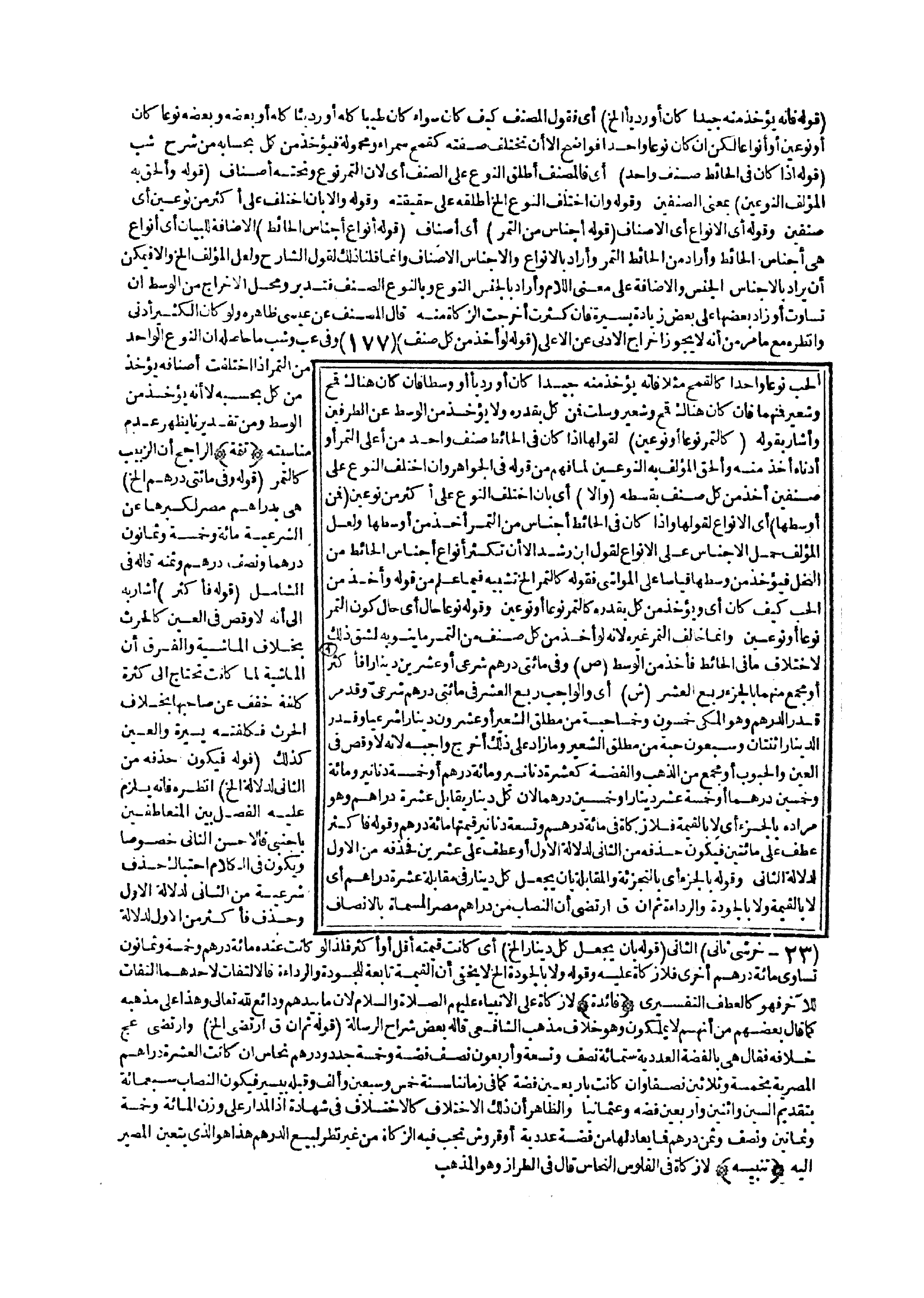 (تَتِمَّةٌ) الرَّاجِحُ أَنَّ الزَّبِيبَ كَالتَّمْرِ. (قَوْلُهُ: وَفِي مِائَتَيْ دِرْهَمٍ. . . إلَخْ) هِيَ بِدَرَاهِمِ مِصْرَ لِكِبَرِهَا عَنْ الشَّرْعِيَّةِ مِائَةٌ وَخَمْسَةٌ وَثَمَانُونَ دِرْهَمًا وَنِصْفُ دِرْهَمٍ وَثُمُنُهُ قَالَ فِي الشَّامِلِ. (قَوْلُهُ: فَأَكْثَرَ) أَشَارَ بِهِ إلَى أَنَّهُ لَا وَقْصٌ فِي الْعَيْنِ كَالْحَرْثِ بِخِلَافِ الْمَاشِيَةِ وَالْفَرْقُ أَنَّ الْمَاشِيَةَ لَمَّا كَانَتْ تَحْتَاجُ إلَى كَثْرَةِ كُلْفَةٍ خُفِّفَ عَنْ صَاحِبِهَا بِخِلَافِ الْحَرْثِ فَكُلْفَتُهُ يَسِيرَةٌ وَالْعَيْنُ كَذَلِكَ. (قَوْلُهُ: فَيَكُونُ حَذْفُهُ مِنْ الثَّانِي لِدَلَالَةِ. . . إلَخْ) اُنْظُرْهُ فَإِنَّهُ يَلْزَمُ عَلَيْهِ الْفَصْلُ بَيْنَ الْمُتَعَاطِفَيْنِ بِأَجْنَبِيٍّ فَالْأَحْسَنُ الثَّانِي خُصُوصًا وَيَكُونُ فِي الْكَلَامِ احْتِبَاكُ حَذْفِ شَرْعِيَّةٍ مِنْ الثَّانِي لِدَلَالَةِ الْأَوَّلِ وَحَذْفِ فَأَكْثَرَ مِنْ الْأَوَّلِ لِدَلَالَةِ الثَّانِي. (قَوْلُهُ: بِأَنْ يُجْعَلَ كُلُّ دِينَارٍ. . . إلَخْ) أَيْ كَانَتْ قِيمَتُهُ أَقَلَّ، أَوْ أَكْثَرَ فَلِذَا لَوْ كَانَتْ عِنْدَهُ مِائَةُ دِرْهَمٍ وَخَمْسَةٌ وَثَمَانُونَ تُسَاوِي مِائَةَ دِرْهَمٍ أُخْرَى فَلَا زَكَاةَ عَلَيْهِ وَقَوْلُهُ: وَلَا بِالْجَوْدَةِ. . . إلَخْ لَا يَخْفَى أَنَّ الْقِيمَةَ تَابِعَةٌ لِلْجَوْدَةِ وَالرَّدَاءَةِ فَالِالْتِفَاتُ لِأَحَدِهِمَا الْتِفَاتٌ لِلْآخَرِ فَهُوَ كَعَطْفِ التَّفْسِيرِيِّ (فَائِدَةٌ) لَا زَكَاةَ عَلَى الْأَنْبِيَاءِ - عَلَيْهِمْ الصَّلَاةُ وَالسَّلَامُ -؛ لِأَنَّ مَا بِيَدِهِمْ وَدَائِعُ لِلَّهِ تَعَالَى وَهَذَا عَلَى مَذْهَبِهِ كَمَا قَالَ بَعْضُهُمْ مِنْ أَنَّهُمْ لَا يَمْلِكُونَ، وَهُوَ خِلَافُ مَذْهَبِ الشَّافِعِيِّ قَالَهُ بَعْضُ شُرَّاحِ الرِّسَالَةِ (قَوْلُهُ: ثُمَّ إنَّ ق ارْتَضَى. . . إلَخْ) وَارْتَضَى عج خِلَافَهُ فَقَالَ هِيَ بِالْفِضَّةِ الْعَدَدِيَّةِ سِتُّمِائَةٍ نِصْفٌ وَتِسْعَةٌ وَأَرْبَعُونَ نِصْفَ فِضَّةٍ وَخَمْسَةٌ جُدُدٌ وَدِرْهَمٌ نُحَاسٌ إنْ كَانَتْ الْعَشَرَةُ دَرَاهِمَ الْمِصْرِيَّةُ بِخَمْسَةٍ وَثَلَاثِينَ نِصْفًا، وَإِنْ كَانَتْ بِأَرْبَعِينَ فِضَّةً كَمَا فِي زَمَانِنَا سَنَةَ خَمْسٍ وَسَبْعِينَ وَأَلْفٍ وَقَبْلَهُ بِيَسِيرٍ فَيَكُونُ النِّصَابُ سَبْعَمِائَةٍ بِتَقْدِيمِ السِّينِ وَاثْنَيْنِ وَأَرْبَعِينَ فِضَّةً وَعُثْمَانِيًّا وَالظَّاهِرُ أَنَّ ذَلِكَ الِاخْتِلَافُ كَالِاخْتِلَافِ فِي شَهَادَةٍ إذْ الْمَدَارُ عَلَى وَزْنِ الْمِائَةِ وَخَمْسَةٍ وَثَمَانِينَ وَنِصْفٍ وَثُمُنٍ دِرْهَمٍ فَمَا يُعَادِلُهَا مِنْ فِضَّةٍ عَدَدِيَّةٍ، أَوْ قُرُوشٍ تَجِبُ فِيهِ الزَّكَاةُ مِنْ غَيْرِ نَظَرٍ لِبَيْعِ الدِّرْهَمِ وَهَذَا هُوَ الَّذِي يَتَعَيَّنُ الْمَصِيرُ إلَيْهِ.