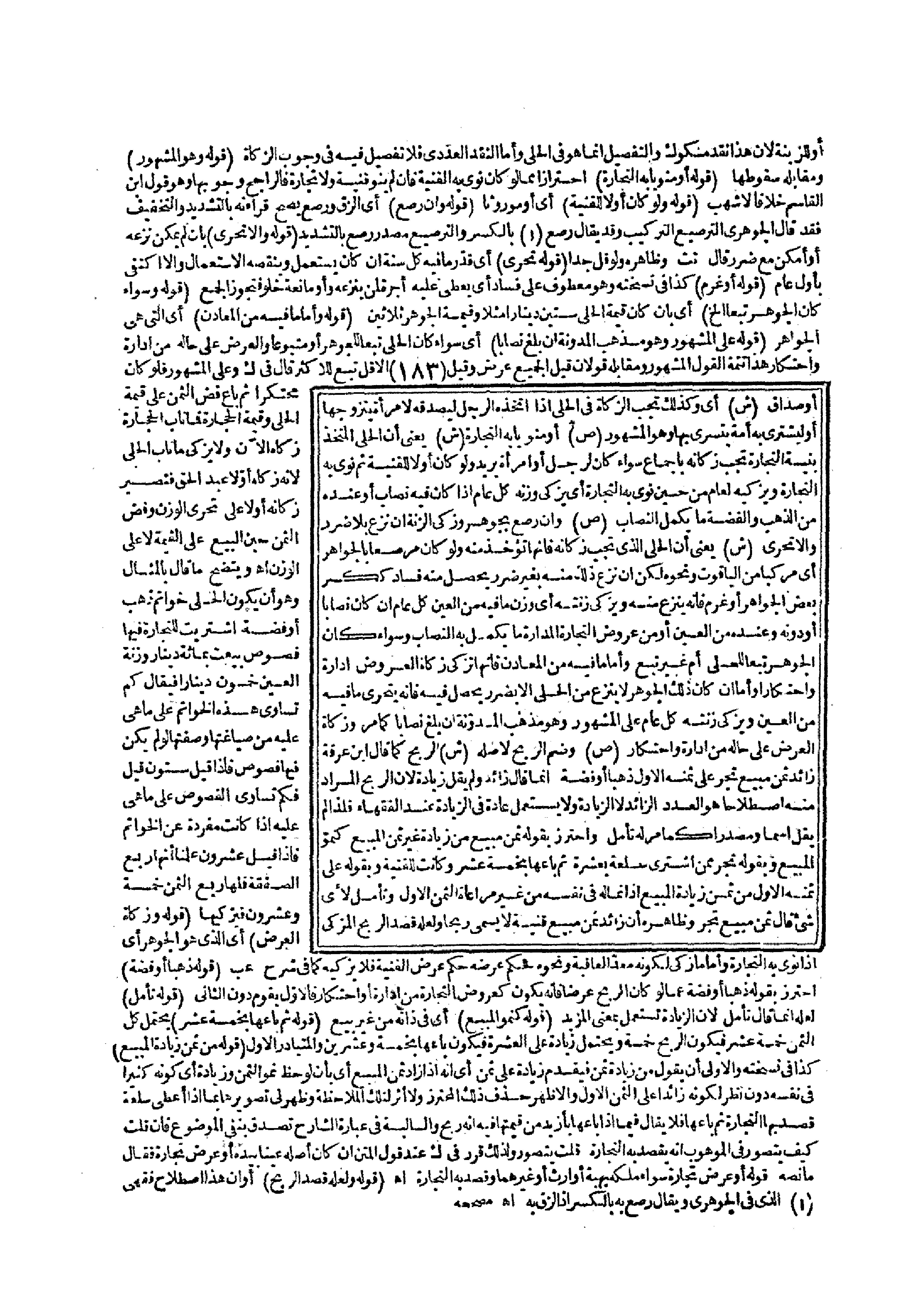 وَيَتَّضِحُ مَا قَالَ بِالْمِثَالِ وَهُوَ أَنْ يَكُونَ الْحُلِيُّ خَوَاتِمَ ذَهَبٍ، أَوْ فِضَّةٍ اُشْتُرِيَتْ لِلتِّجَارَةِ فِيهَا فُصُوصٌ بِيعَتْ بِمِائَةِ دِينَارٍ وَزِنَةُ الْعَيْنِ خَمْسُونَ دِينَارًا فَيُقَالُ كَمْ تُسَاوِي هَذِهِ الْخَوَاتِمُ عَلَى مَا هِيَ عَلَيْهِ مِنْ صِيَاغَتِهَا وَصِفَتِهَا لَوْ لَمْ يَكُنْ فِيهَا فُصُوصٌ فَإِذَا قِيلَ سِتُّونَ قِيلَ فَكَمْ تُسَاوِي الْفُصُوصُ عَلَى مَا هِيَ عَلَيْهِ إذَا كَانَتْ مُفْرَدَةً عَنْ الْخَوَاتِمِ فَإِذَا قِيلَ عِشْرُونَ عَلِمْنَا أَنَّهَا رُبُعُ الصَّفْقَةِ فَلَهَا رُبُعُ الثَّمَنِ خَمْسَةٌ وَعِشْرُونَ فَيُزَكِّيهَا. (قَوْلُهُ وَزَكَاةُ الْعَرَضِ) أَيْ الَّذِي هُوَ الْجَوْهَرُ أَيْ إذَا نَوَى بِهِ التِّجَارَةَ، وَأَمَّا مَا زُكِّيَ لِكَوْنِهِ مُعَدًّا لِعَاقِبَةٍ وَنَحْوِهِ فَحُكْمُ عَرَضِهِ حُكْمُ عَرَضِ الْقِنْيَةِ فَلَا يُزَكِّيهِ كَمَا فِي شَرْحِ عب