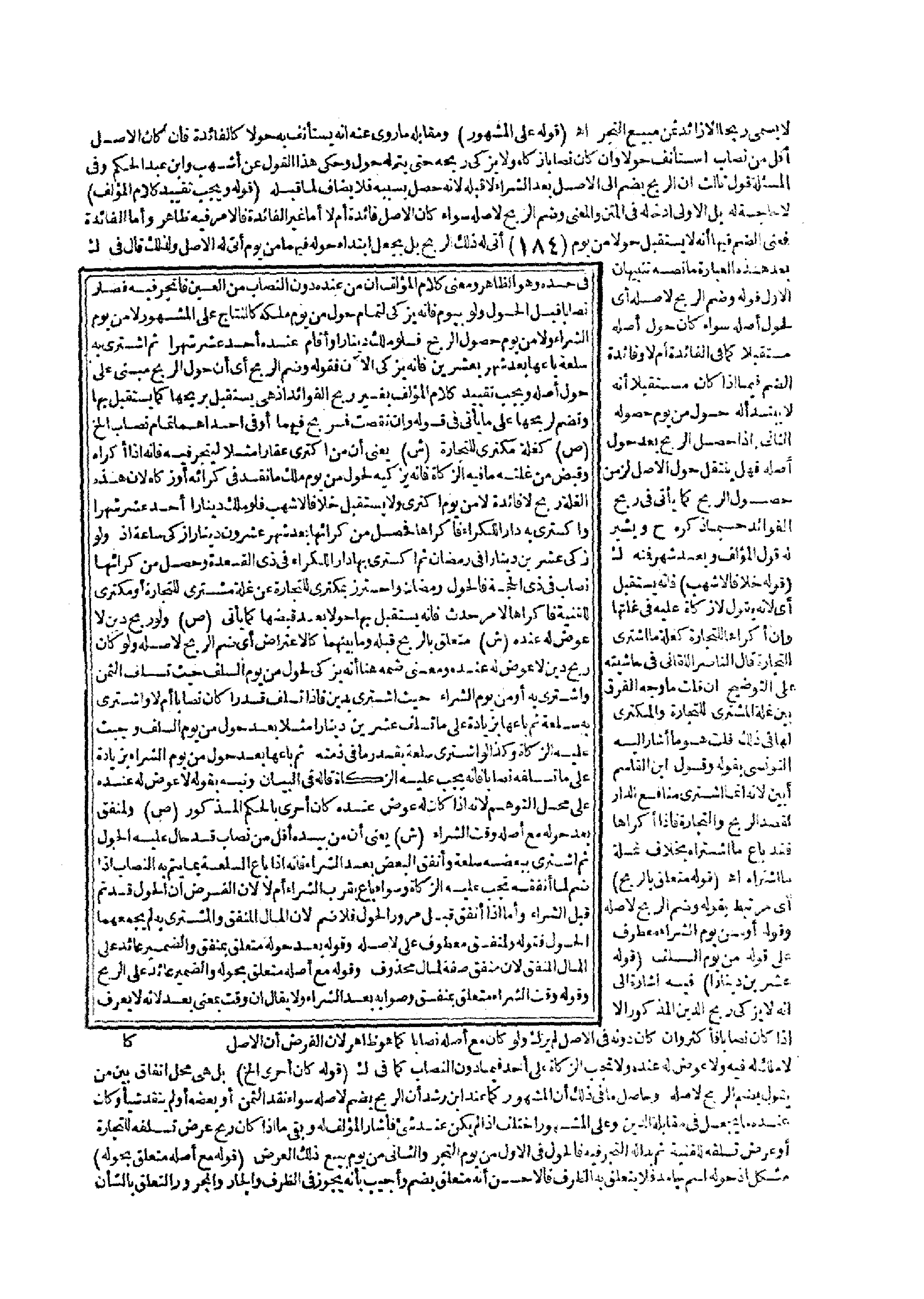 فِي حَدِّهِ، وَهُوَ الظَّاهِرُ وَمَعْنَى كَلَامِ الْمُؤَلِّفِ أَنَّ مَنْ عِنْدَهُ دُونَ النِّصَابِ مِنْ الْعَيْنِ فَاتَّجَرَ فِيهِ فَصَارَ نِصَابًا قَبْلَ الْحَوْلِ وَلَوْ بِيَوْمٍ فَإِنَّهُ يُزَكِّي لِتَمَامِ حَوْلٍ مِنْ يَوْمِ مِلْكِهِ كَالنِّتَاجِ عَلَى الْمَشْهُورِ لَا مِنْ يَوْمِ الشِّرَاءِ وَلَا مِنْ يَوْمِ حُصُولِ الرِّبْحِ فَلَوْ مَلَكَ دِينَارًا وَأَقَامَ عِنْدَهُ أَحَدَ عَشَرَ شَهْرًا ثُمَّ اشْتَرَى بِهِ سِلْعَةً بَاعَهَا بَعْدَ شَهْرٍ بِعِشْرِينَ فَإِنَّهُ يُزَكِّي الْآنَ فَقَوْلُهُ: وَضُمَّ الرِّبْحُ أَيْ أَنَّ حَوْلَ الرِّبْحِ مَبْنِيٌّ عَلَى حَوْلِ أَصْلِهِ وَيَجِبُ تَقْيِيدُ كَلَامِ الْمُؤَلِّفِ بِغَيْرِ رِبْحِ الْفَوَائِدِ إذْ هِيَ يُسْتَقْبَلُ بِرِبْحِهَا كَمَا يُسْتَقْبَلُ بِهَا وَتُضَمُّ لِرِبْحِهَا عَلَى مَا يَأْتِي فِي قَوْلِهِ: وَإِنْ نَقَصَتْ فَرَبِحَ فِيهِمَا، أَوْ فِي إحْدَاهُمَا تَمَامَ نِصَابٍ. . . إلَخْ.