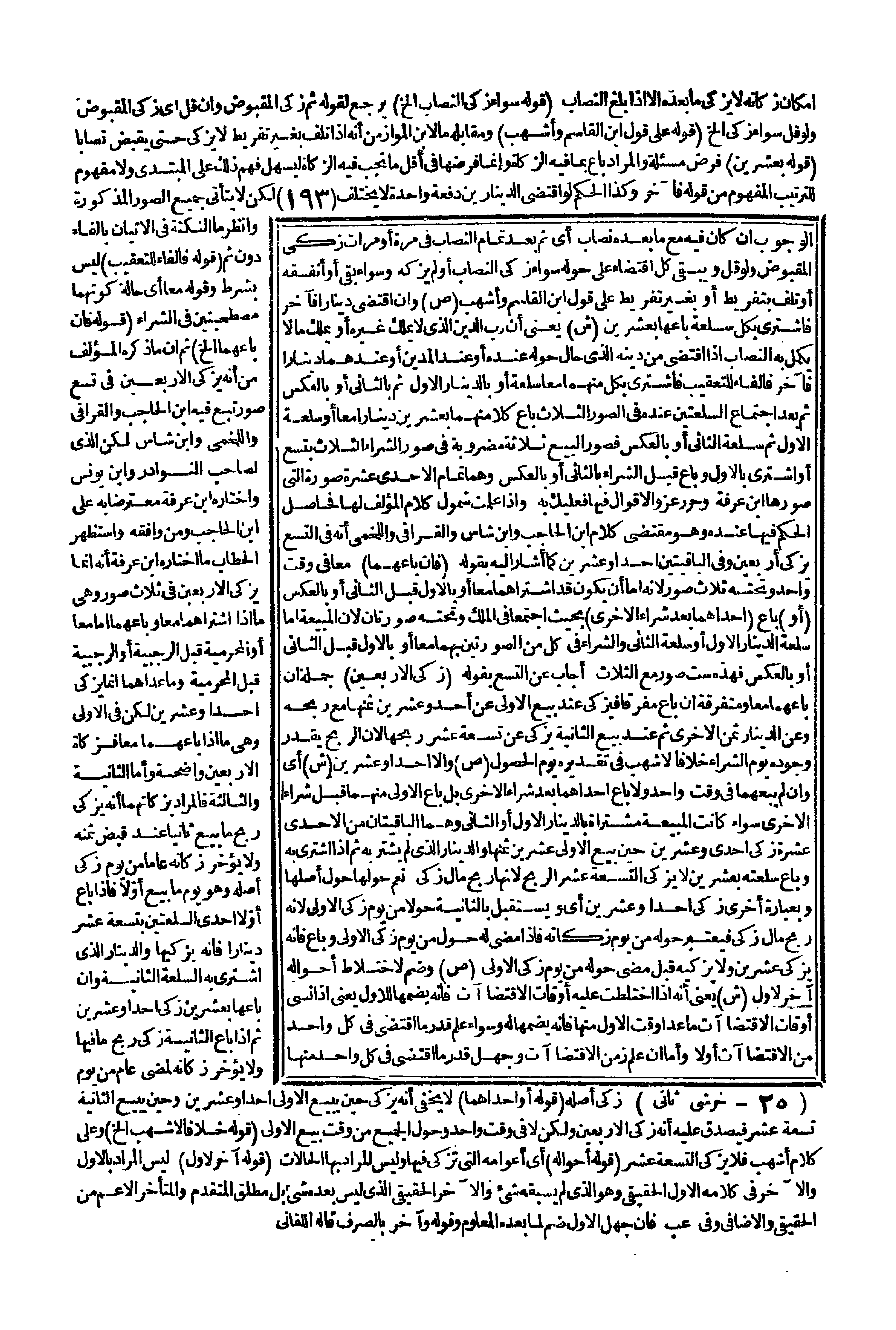(قَوْلُهُ: عَلَى قَوْلِ ابْنِ الْقَاسِمِ وَأَشْهَبَ) وَمُقَابِلُهُ مَا لِابْنِ الْمَوَّازِ مِنْ أَنَّهُ إذَا تَلِفَ بِغَيْرِ تَفْرِيطٍ لَا يُزَكَّى حَتَّى يَقْبِضَ نِصَابًا. (قَوْلُهُ بِعِشْرِينَ) فَرْضُ مَسْأَلَةٍ وَالْمُرَادُ بَاعَ بِمَا فِيهِ الزَّكَاةُ وَإِنَّمَا فَرْضُهَا فِي أَقَلِّ مَا تَجِبُ فِيهِ الزَّكَاةُ لِيَسْهُلَ فَهْمُ ذَلِكَ عَلَى الْمُبْتَدِئِ وَلَا مَفْهُومَ لِلتَّرْتِيبِ الْمَفْهُومِ مِنْ قَوْلِهِ: فَأَخَّرَ وَكَذَا الْحُكْمُ لَوْ اقْتَضَى الدِّينَارَيْنِ دَفْعَةً وَاحِدَةً لَا يَخْتَلِفُ لَكِنْ لَا يَتَأَتَّى جَمِيعُ الصُّوَرِ الْمَذْكُورَةِ وَانْظُرْ مَا النُّكْتَةُ فِي الْإِتْيَانِ بِالْفَاءِ دُونَ ثُمَّ. (قَوْلُهُ: فَالْفَاءُ لِلتَّعْقِيبِ) لَيْسَ بِشَرْطٍ وَقَوْلُهُ: مَعًا أَيْ حَالَةَ كَوْنِهِمَا مُصْطَحَبَتَيْنِ فِي الشِّرَاءِ.