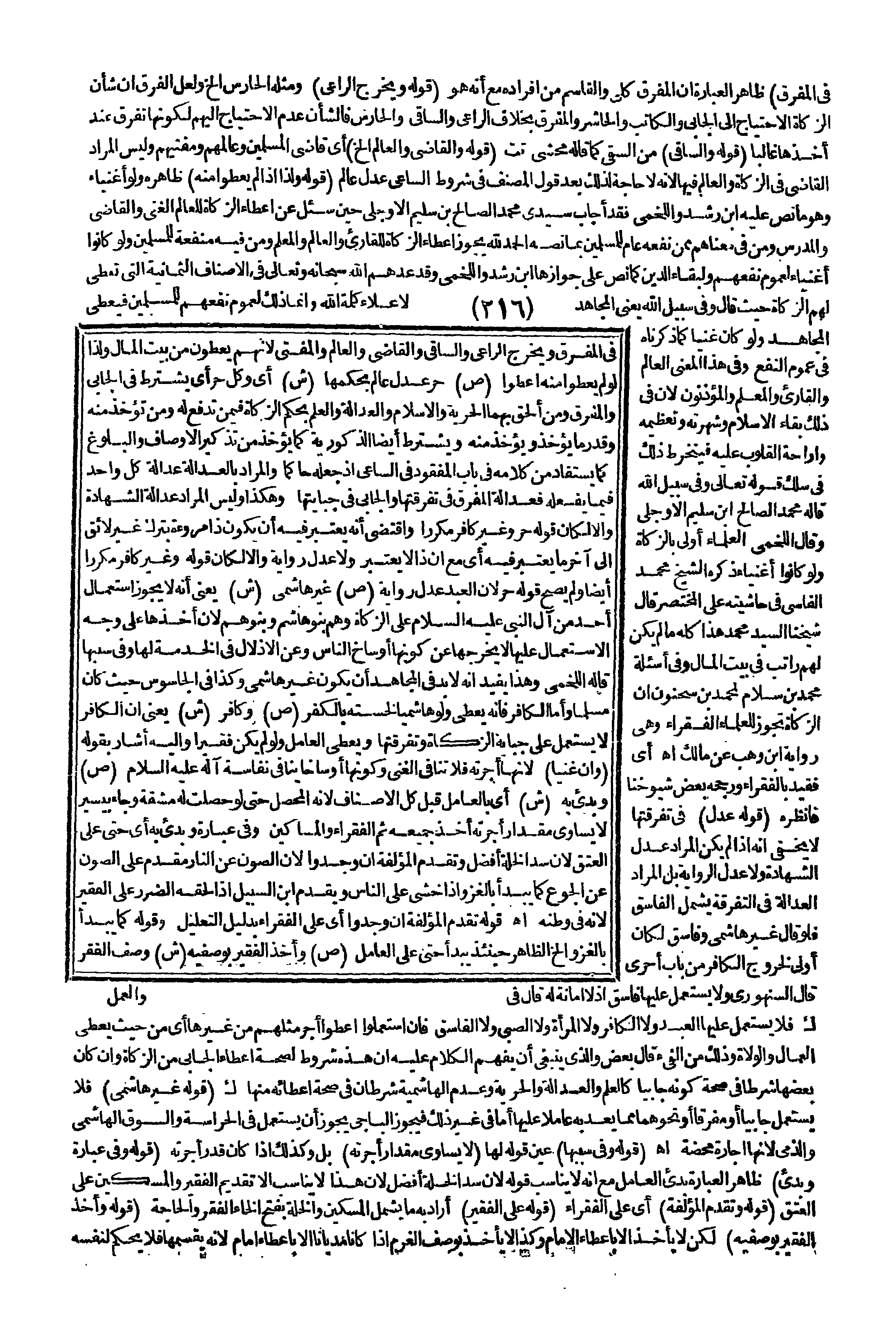 وَفِي أَسْئِلَةِ مُحَمَّدِ بْنِ سَلَّامٍ لِمُحَمَّدِ بْنِ سَحْنُونَ أَنَّ الزَّكَاةَ تَجُوزُ لِلْعُلَمَاءِ الْفُقَرَاءِ وَهِيَ رِوَايَةُ ابْنِ وَهْبٍ عَنْ مَالِكٍ اهـ. أَيْ: فَقَيَّدَ بِالْفُقَرَاءِ وَرَجَّحَهُ بَعْضُ شُيُوخِنَا فَانْظُرْهُ (قَوْلُهُ: عَدْلٌ) فِي تَفْرِقَتِهَا لَا يَخْفَى أَنَّهُ إذًا لَمْ يَكُنْ الْمُرَادُ عَدْلَ الشَّهَادَةِ وَلَا عَدْلَ الرِّوَايَةِ، بَلْ الْمُرَادُ الْعَدَالَةُ فِي التَّفْرِقَةِ يَشْمَلُ الْفَاسِقَ فَلَوْ قَالَ: غَيْرُ هَاشِمِيٍّ وَفَاسِقٍ لَكَانَ أَوْلَى لِخُرُوجِ الْكَافِرِ مِنْ بَابٍ أَحْرَى قَالَ السَّنْهُورِيُّ وَلَا يُسْتَعْمَلُ عَلَيْهَا فَاسِقٌ إذْ لَا أَمَانَةَ لَهُ قَالَ فِي ك فَلَا يُسْتَعْمَلُ عَلَيْهَا الْعَبْدُ وَلَا الْكَافِرُ وَلَا الْمَرْأَةُ وَلَا الصَّبِيُّ وَلَا الْفَاسِقُ فَإِنْ اُسْتُعْمِلُوا اُعْطُوا أَجْرَ مِثْلِهِمْ مِنْ غَيْرِهَا أَيْ: مِنْ حَيْثُ يُعْطَى الْعُمَّالُ وَالْوُلَاةُ، وَذَلِكَ مِنْ الْفَيْءِ قَالَ بَعْضٌ: وَاَلَّذِي يَنْبَغِي أَنْ يُفْهَمَ الْكَلَامُ عَلَيْهِ أَنَّ هَذِهِ شُرُوطٌ لِصِحَّةِ إعْطَاءِ الْجَابِي مِنْ الزَّكَاةِ وَإِنْ كَانَ بَعْضُهَا شَرْطًا فِي صِحَّةِ كَوْنِهِ جَابِيًا كَالْعِلْمِ وَالْعَدَالَةِ وَالْحُرِّيَّةِ وَعَدَمِ الْهَاشِمِيَّةِ شَرْطَانِ فِي صِحَّةِ إعْطَائِهِ مِنْهَا ك