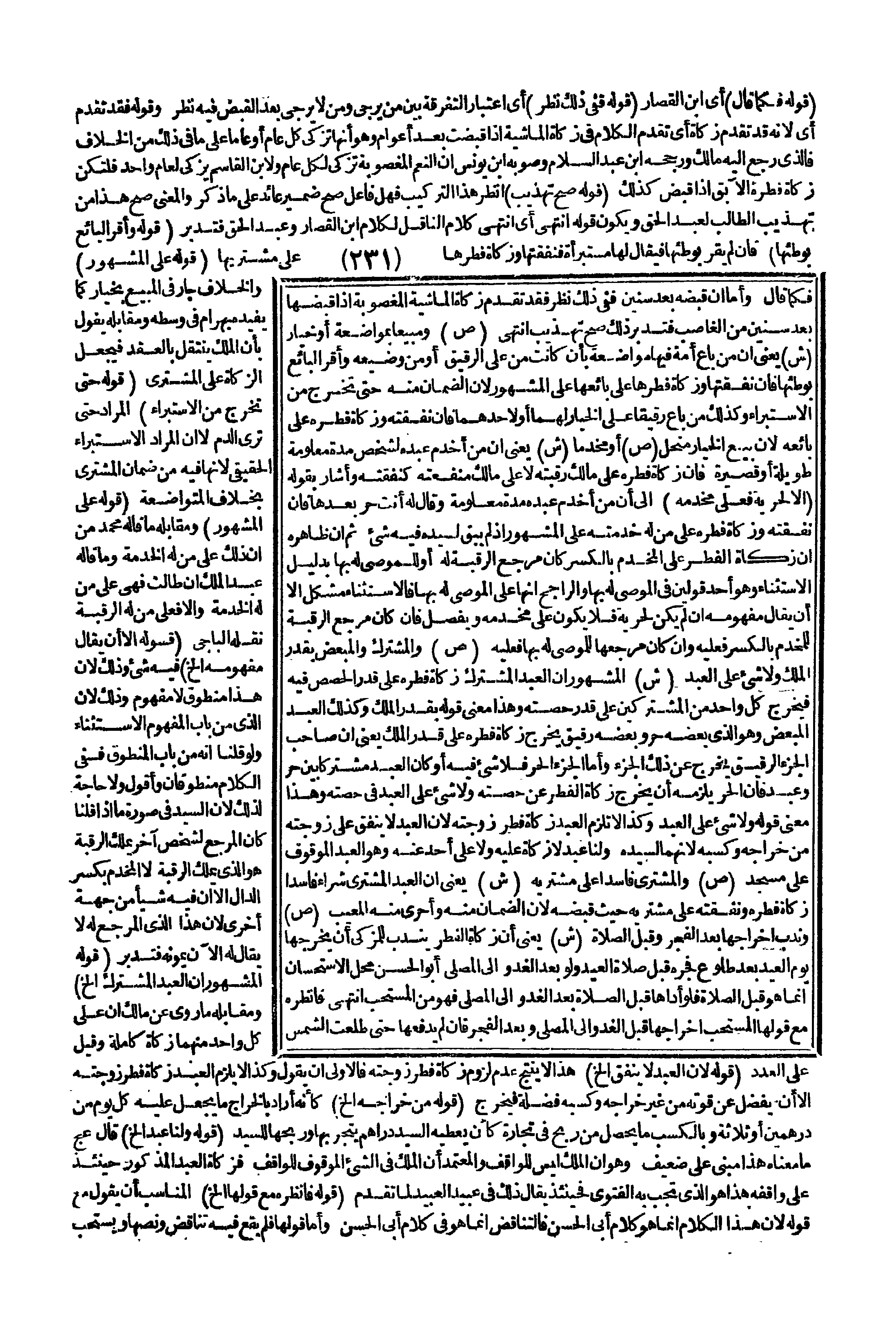 (قَوْلُهُ: الْمَشْهُورُ أَنَّ الْعَبْدَ الْمُشْتَرَكَ إلَخْ) وَمُقَابِلُهُ مَا رُوِيَ عَنْ مَالِكٍ أَنَّ عَلَى كُلِّ وَاحِدٍ مِنْهُمَا زَكَاةً كَامِلَةً، وَقِيلَ: عَلَى الْعَدَدِ (قَوْلُهُ:؛ لِأَنَّ الْعَبْدَ لَا يُنْفِقُ إلَخْ) هَذَا لَا يُنْتِجُ عَدَمَ لُزُومِ زَكَاةِ فِطْرِ زَوْجَتِهِ فَالْأَوْلَى أَنْ يَقُولَ: وَكَذَا لَا يَلْزَمُ الْعَبْدَ زَكَاةُ فِطْرِ زَوْجَتِهِ إلَّا أَنْ يَفْضُلَ عَنْ قُوتِهِ مِنْ غَيْرِ خَرَاجِهِ وَكَسْبِهِ فَضْلَةٌ فَيُخْرِجُ، (قَوْلُهُ: مِنْ خَرَاجِهِ إلَخْ) كَأَنَّهُ أَرَادَ بِالْخَرَاجِ مَا يُجْعَلُ عَلَيْهِ كُلَّ يَوْمٍ مِنْ دِرْهَمَيْنِ، أَوْ ثَلَاثَةٍ وَبِالْكَسْبِ مَا يَحْصُلُ مِنْ رِبْحٍ فِي تِجَارَةٍ، كَأَنْ يُعْطِيَهُ السَّيِّدُ دَرَاهِمَ يَتَّجِرُ بِهَا وَرِبْحُهَا لِلسَّيِّدِ (قَوْلُهُ: وَلَنَا عَبْدٌ إلَخْ) قَالَ عج مَا مَعْنَاهُ: هَذَا مَبْنِيٌّ عَلَى ضَعِيفٍ وَهُوَ أَنَّ الْمِلْكَ لَيْسَ لِلْوَاقِفِ، وَالْمُعْتَمَدُ أَنَّ الْمِلْكَ فِي الشَّيْءِ الْمَوْقُوفِ لِلْوَاقِفِ فَزَكَاةُ الْعَبْدِ الْمَذْكُورِ حِينَئِذٍ عَلَى وَاقِفِهِ هَذَا هُوَ الَّذِي تَجِبُ بِهِ الْفَتْوَى فَحِينَئِذٍ يُقَالُ ذَلِكَ فِي عَبِيدِ الْعَبِيدِ لِمَا تَقَدَّمَ.