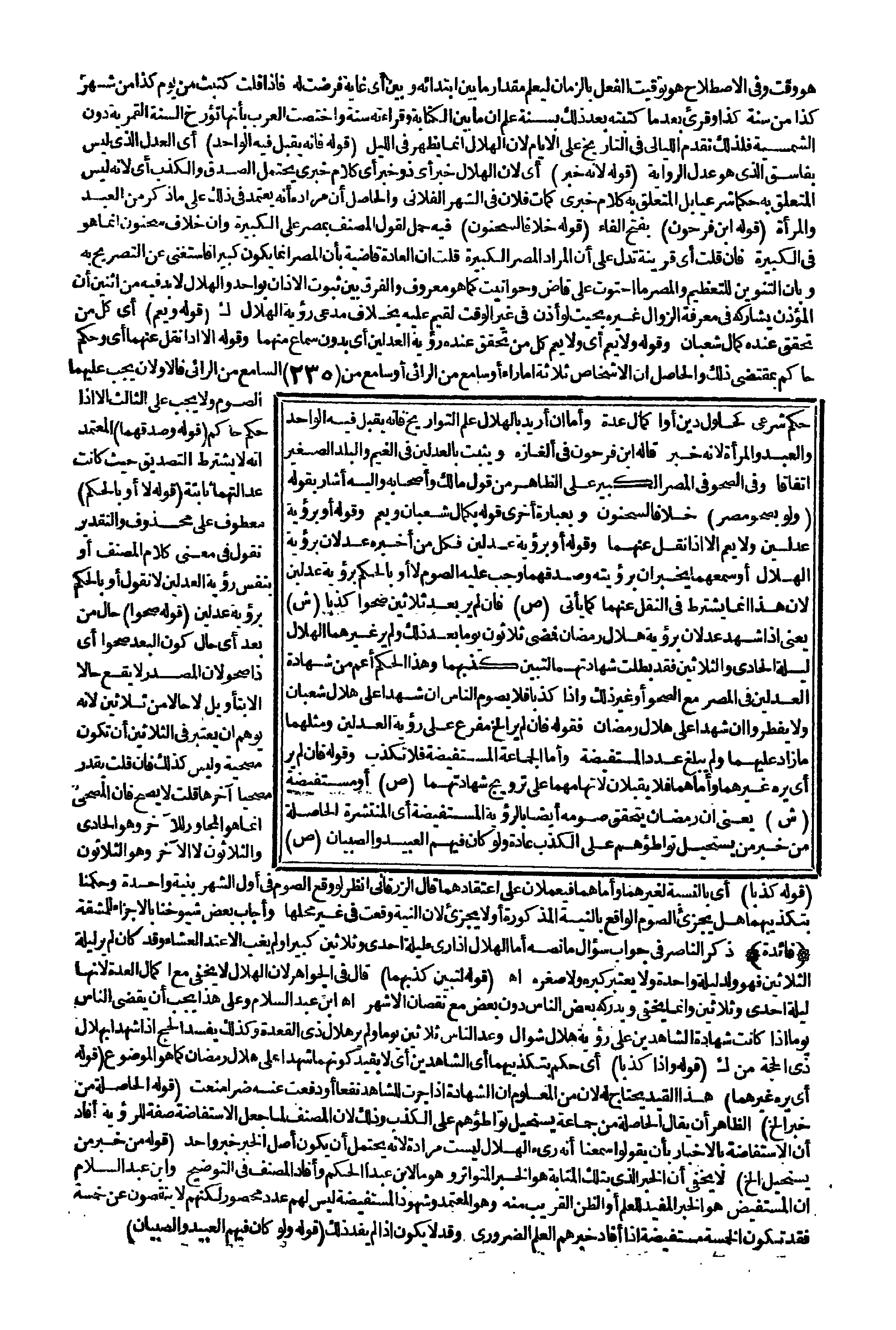 حُكْمٌ شَرْعِيٌّ: كَحُلُولِ دَيْنٍ أَوْ إكْمَالِ عِدَّةٍ، وَأَمَّا إنْ أُرِيدَ بِالْهِلَالِ عِلْمُ التَّوَارِيخِ فَإِنَّهُ يُقْبَلُ فِيهِ الْوَاحِدُ وَالْعَبْدُ وَالْمَرْأَةُ؛ لِأَنَّهُ خَبَرٌ، قَالَهُ ابْنُ فَرْحُونٍ فِي أَلْغَازِهِ، وَيَثْبُتُ بِالْعَدْلَيْنِ فِي الْغَيْمِ وَالْبَلَدِ الصَّغِيرِ اتِّفَاقًا، وَفِي الصَّحْوِ فِي الْمِصْرِ الْكَبِيرِ، عَلَى الظَّاهِرِ مِنْ قَوْلِ مَالِكٍ وَأَصْحَابِهِ، وَإِلَيْهِ أَشَارَ بِقَوْلِهِ: (وَلَوْ بِصَحْوِ مِصْرٍ) خِلَافًا لِسَحْنُونٍ وَبِعِبَارَةٍ أُخْرَى قَوْلُهُ: بِكَمَالِ شَعْبَانَ وَيَعُمُّ، وَقَوْلُهُ: أَوْ بِرُؤْيَةِ عَدْلَيْنِ وَلَا يَعُمُّ إلَّا إذَا نُقِلَ عَنْهُمَا وَقَوْلُهُ: أَوْ بِرُؤْيَةِ عَدْلَيْنِ فَكُلُّ مَنْ أَخْبَرَهُ عَدْلَانِ بِرُؤْيَةِ الْهِلَالِ أَوْ سَمِعَهُمَا يُخْبِرَانِ بِرُؤْيَتِهِ وَصَدَّقَهُمَا وَجَبَ عَلَيْهِ الصَّوْمُ لَا أَوْ بِالْحُكْمِ بِرُؤْيَةِ عَدْلَيْنِ؛ لِأَنَّ هَذَا إنَّمَا يُشْتَرَطُ فِي النَّقْلِ عَنْهُمَا كَمَا يَأْتِي