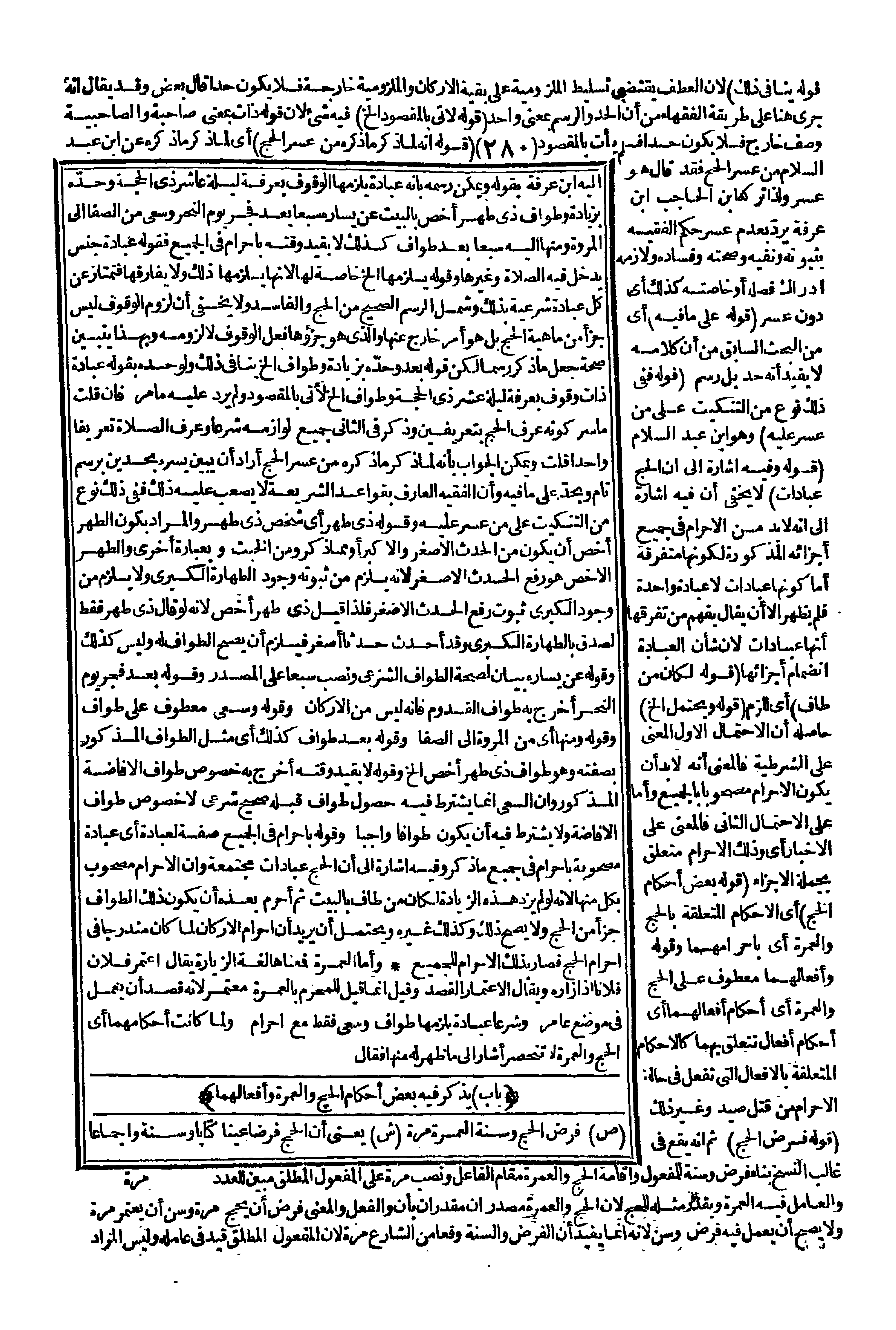 إلَيْهِ ابْنُ عَرَفَةَ بِقَوْلِهِ: وَيُمْكِنُ رَسْمُهُ بِأَنَّهُ عِبَادَةٌ يَلْزَمُهَا الْوُقُوفُ بِعَرَفَةَ لَيْلَةَ عَاشِرِ ذِي الْحِجَّةِ، وَحَدُّهُ بِزِيَارَةٍ وَطَوَافِ ذِي طُهْرٍ أَخَصُّ بِالْبَيْتِ عَنْ يَسَارِهِ سَبْعًا بَعْدَ فَجْرِ يَوْمِ النَّحْرِ، وَسَعْيٍ مِنْ الصَّفَا إلَى الْمَرْوَةِ، وَمِنْهَا إلَيْهِ سَبْعًا بَعْدَ طَوَافٍ كَذَلِكَ لَا بِقَيْدِ وَقْتِهِ بِإِحْرَامٍ فِي الْجَمِيعِ، فَقَوْلُهُ: عِبَادَةٌ جِنْسٌ يَدْخُلُ فِيهِ الصَّلَاةُ وَغَيْرُهَا وَقَوْلُهُ يَلْزَمُهَا إلَخْ خَاصَّةً لَهَا؛ لِأَنَّهَا يَلْزَمُهَا ذَلِكَ، وَلَا يُفَارِقُهَا فَتَمْتَازُ عَنْ كُلِّ عِبَادَةٍ شَرْعِيَّةٍ بِذَلِكَ وَشَمِلَ الرَّسْمَ الصَّحِيحَ مِنْ الْحَجِّ وَالْفَاسِدَ وَلَا يَخْفَى أَنَّ لُزُومَ الْوُقُوفِ لَيْسَ جُزْءًا مِنْ مَاهِيَّةِ الْحَجِّ، بَلْ هُوَ أَمْرٌ خَارِجٌ عَنْهَا، وَاَلَّذِي هُوَ جُزْؤُهَا فِعْلُ الْوُقُوفِ لَا لُزُومُهُ وَبِهَذَا يَتَبَيَّنُ صِحَّةُ جَعْلِ مَا ذَكَرَ رَسْمًا لَكِنَّ قَوْلَهُ بَعْدُ: وَحَدُّهُ بِزِيَارَةٍ وَطَوَافِ إلَخْ يُنَافِي ذَلِكَ. وَلَوْ حَدَّهُ بِقَوْلِهِ: عِبَادَةٌ ذَاتُ وُقُوفٍ بِعَرَفَةَ لَيْلَةَ عَشْرِ ذِي الْحِجَّةِ وَطَوَافٌ إلَخْ لَأَتَى بِالْمَقْصُودِ وَلَمْ يُرَدَّ عَلَيْهِ مَا مَرَّ، فَإِنْ قُلْتَ: مَا سِرُّ كَوْنِهِ عَرَّفَ الْحَجَّ بِتَعْرِيفَيْنِ وَذَكَرَ فِي الثَّانِي جَمِيعَ لَوَازِمِهِ شَرْعًا وَعَرَّفَ الصَّلَاةَ تَعْرِيفًا وَاحِدًا؟ قُلْتُ: وَيُمْكِنُ الْجَوَابُ بِأَنَّهُ لَمَّا ذَكَرَ مَا ذَكَرَهُ مِنْ عُسْرِ الْحَجِّ أَرَادَ أَنْ يُبَيِّنَ يُسْرَهُ بِحَدَّيْنِ بِرَسْمٍ تَامٍّ وَبِحَدٍّ عَلَى مَا فِيهِ وَأَنَّ الْفَقِيهَ الْعَارِفَ بِقَوَاعِد الشَّرِيعَةِ لَا يَصْعُبُ عَلَيْهِ ذَلِكَ، فَفِي ذَلِكَ نَوْعٌ مِنْ التَّنْكِيتِ عَلَى مَنْ عَسِرَ عَلَيْهِ، وَقَوْلُهُ: ذِي طُهْرٍ أَيْ: شَخْصٍ ذِي طُهْرٍ، وَالْمُرَادُ بِكَوْنِ الطُّهْرِ أَخَصُّ أَنْ يَكُونَ مِنْ الْحَدَثِ الْأَصْغَرِ وَالْأَكْبَرِ، أَوْ مِمَّا ذَكَرَ وَمِنْ الْخَبَثِ، وَبِعِبَارَةٍ أُخْرَى وَالطُّهْرُ الْأَخَصُّ هُوَ رَفْعُ الْحَدَثِ الْأَصْغَرِ؛ لِأَنَّهُ يَلْزَمُ مِنْ ثُبُوتِهِ وُجُودُ الطَّهَارَةِ الْكُبْرَى، وَلَا يَلْزَمُ مِنْ وُجُودِ الْكُبْرَى ثُبُوتُ رَفْعِ الْحَدَثِ الْأَصْغَرِ فَلِذَا قِيلَ ذِي طُهْرٍ أَخَصُّ؛ لِأَنَّهُ لَوْ قَالَ ذِي طُهْرٍ فَقَطْ لَصُدِّقَ بِالطَّهَارَةِ الْكُبْرَى، وَقَدْ أَحْدَثَ حَدَثًا أَصْغَرَ فَيَلْزَمُ أَنْ يَصِحَّ الطَّوَافُ لَهُ وَلَيْسَ كَذَلِكَ، وَقَوْلُهُ: عَنْ يَسَارِهِ بَيَانٌ لِصِحَّةِ الطَّوَافِ الشَّرْعِيِّ وَنَصَبَ سَبْعًا عَلَى الْمَصْدَرِ، وَقَوْلُهُ: بَعْدَ فَجْرِ يَوْمِ النَّحْرِ أَخْرَجَ بِهِ طَوَافَ الْقُدُومِ فَإِنَّهُ لَيْسَ مِنْ الْأَرْكَانِ، وَقَوْلُهُ: وَسَعْيٍ مَعْطُوفٌ عَلَى طَوَافٍ، وَقَوْلُهُ:، وَمِنْهَا أَيْ: مِنْ الْمَرْوَةِ إلَى الصَّفَا. وَقَوْلُهُ: بَعْدَ طَوَافٍ كَذَلِكَ أَيْ: مِثْلُ الطَّوَافِ الْمَذْكُورِ بِصِفَتِهِ، وَهُوَ طَوَافُ ذِي طُهْرٍ أَخَصُّ إلَخْ، وَقَوْلُهُ: لَا بِقَيْدِ وَقْتِهِ أَخْرَجَ بِهِ خُصُوصَ طَوَافِ الْإِفَاضَةِ الْمَذْكُورِ وَإِنَّ السَّعْيَ إنَّمَا يُشْتَرَطُ فِيهِ حُصُولُ طَوَافٍ قَبْلَهُ صَحِيحٍ شَرْعِيٍّ؛ لَا خُصُوصَ طَوَافِ الْإِفَاضَةِ، وَلَا يُشْتَرَطُ فِيهِ أَنْ يَكُونَ طَوَافًا وَاجِبًا، وَقَوْلُهُ: بِإِحْرَامٍ فِي الْجَمِيعِ صِفَةً لِعِبَادَةٍ أَيْ: عِبَادَةٍ مَصْحُوبَةٍ بِإِحْرَامٍ فِي جَمِيعِ مَا ذَكَرَ وَفِيهِ إشَارَةٌ إلَى أَنَّ الْحَجَّ عِبَادَاتٌ مُجْتَمَعَةٌ، وَإِنَّ الْإِحْرَامَ مَصْحُوبٌ بِكُلٍّ مِنْهَا؛ لِأَنَّهُ 