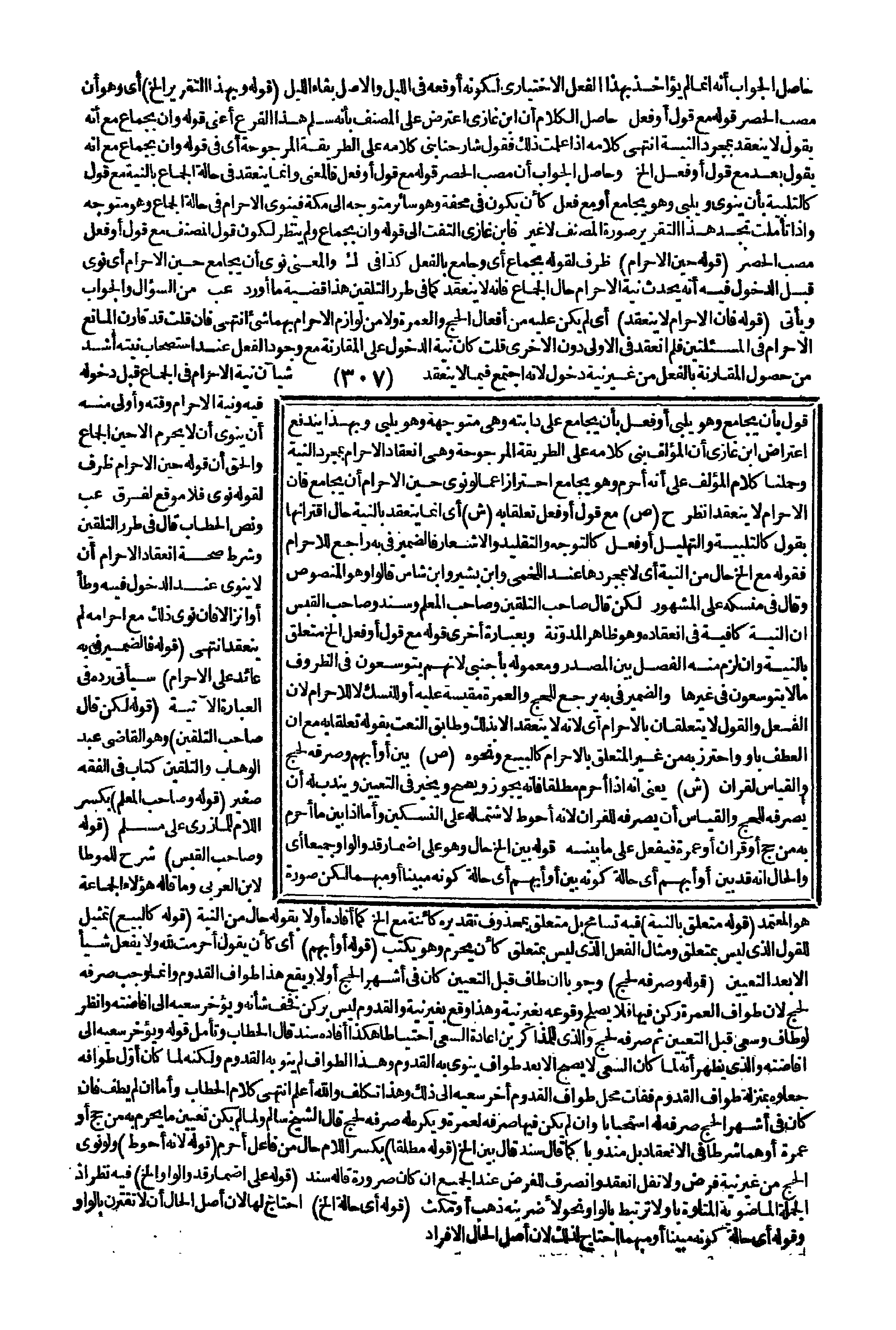 وَنَصَّ الْحَطَّابُ قَالَ فِي طُرَرِ التَّلْقِينِ وَشَرْطُ صِحَّةِ انْعِقَادِ الْإِحْرَامِ أَنْ لَا يَنْوِيَ عِنْدَ الدُّخُولِ فِيهِ وَطْئًا، أَوْ إنْزَالًا فَإِنْ نَوَى ذَلِكَ مَعَ إحْرَامِهِ لَمْ يَنْعَقِدْ انْتَهَى (قَوْلُهُ فَالضَّمِيرُ فِي بِهِ عَائِدٌ عَلَى الْإِحْرَامِ) سَيَأْتِي رَدُّهُ فِي الْعِبَارَةِ الْآتِيَةِ (قَوْلُهُ: لَكِنْ قَالَ صَاحِبُ التَّلْقِينِ) وَهُوَ الْقَاضِي عَبْدُ الْوَهَّابِ وَالتَّلْقِينُ كِتَابٌ فِي الْفِقْهِ صَغِيرٌ (قَوْلُهُ: وَصَاحِبُ الْمُعَلِّمِ) بِكَسْرِ اللَّامِ لِلْمَازِرِيِّ عَلَى مُسْلِمٍ (قَوْلُهُ: وَصَاحِبُ الْقَبَسِ) شَرْحٌ لِلْمُوَطَّأِ لِابْنِ الْعَرَبِيِّ وَمَا قَالَهُ هَؤُلَاءِ الْجَمَاعَةُ هُوَ الْمُعْتَمَدُ (قَوْلُهُ: مُتَعَلِّقٌ بِالنِّيَّةِ) فِيهِ تَسَامُحٌ، بَلْ مُتَعَلِّقٌ بِمَحْذُوفٍ تَقْدِيرُهُ كَائِنَةً مَعَ إلَخْ كَمَا أَفَادَهُ أَوَّلًا بِقَوْلِهِ: حَالٌ مِنْ النِّيَّةِ.