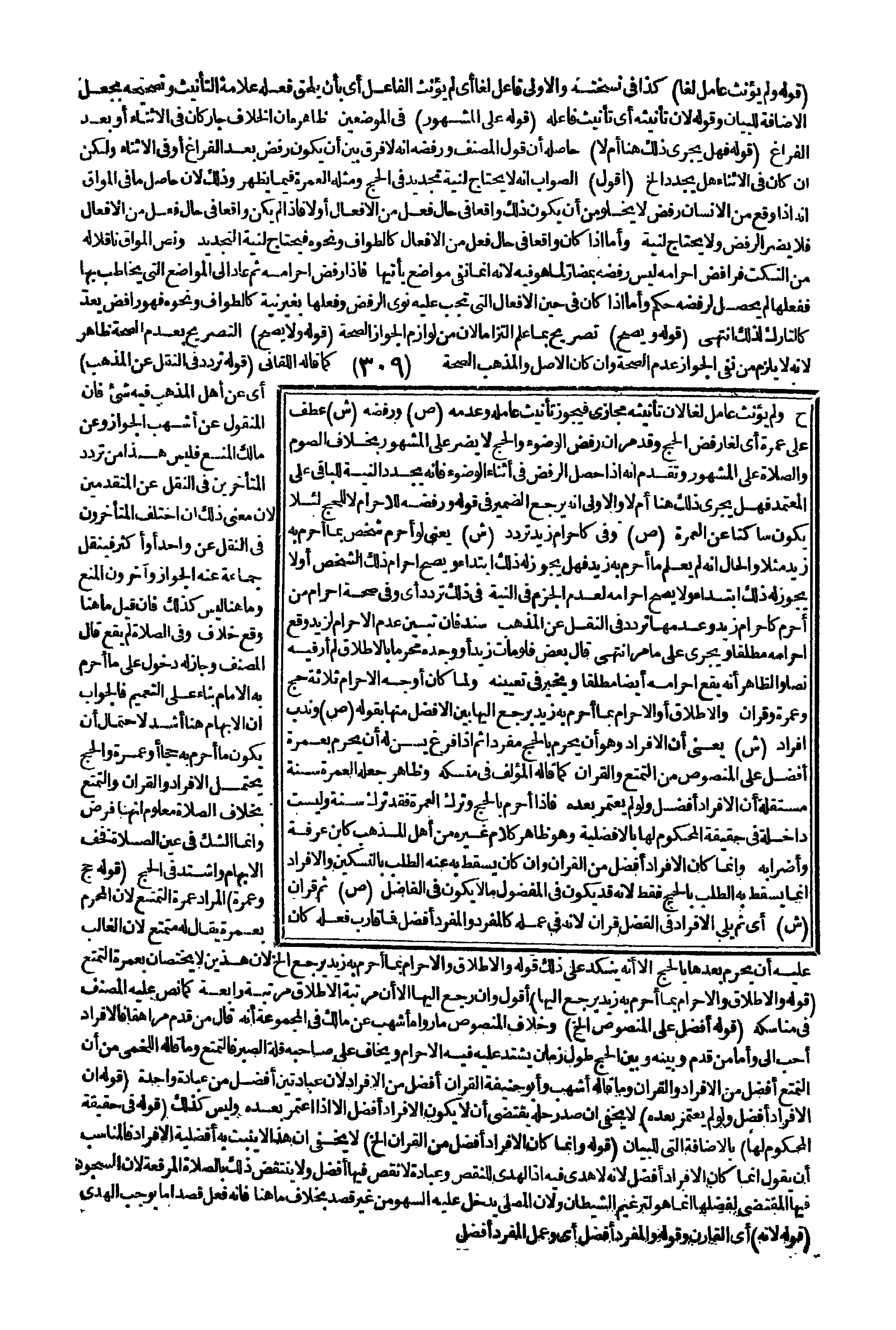 (قَوْلُهُ: أَفْضَلُ عَلَى الْمَنْصُوصِ إلَخْ) وَخِلَافُ الْمَنْصُوصِ مَا رَوَاهُ أَشْهَبُ عَنْ مَالِكٍ فِي الْمَجْمُوعَةِ أَنَّهُ قَالَ: مَنْ قَدَّمَ مُرَاهِقًا فَالْإِفْرَادُ أَحَبُّ إلَيَّ وَأَمَّا مَنْ قَدَّمَ وَبَيْنَهُ وَبَيْنَ الْحَجِّ طُولُ زَمَانٍ يَشْتَدُّ عَلَيْهِ فِيهِ الْإِحْرَامُ وَيَخَافُ عَلَى صَاحِبِهِ قِلَّةَ الصَّبْرِ فَالتَّمَتُّعُ، وَمَا قَالَهُ اللَّخْمِيُّ مِنْ أَنَّ التَّمَتُّعَ أَفْضَلُ مِنْ الْإِفْرَادِ وَالْقِرَانِ، وَمَا قَالَهُ أَشْهَبُ وَأَبُو حَنِيفَةَ: الْقِرَانُ أَفْضَلُ مِنْ الْإِفْرَادِ؛ لِأَنَّ عِبَادَتَيْنِ أَفْضَلُ مِنْ عِبَادَةٍ وَاحِدَةٍ (قَوْلُهُ: إنَّ الْإِفْرَادَ أَفْضَلُ وَلَوْ لَمْ يَعْتَمِرْ بَعْدَهُ) لَا يَخْفَى أَنَّ صَدْرَ حِلِّهِ يَقْتَضِي أَنْ لَا يَكُونَ الْإِفْرَادُ أَفْضَلُ إلَّا إذَا اعْتَمَرَ بَعْدَهُ، وَلَيْسَ كَذَلِكَ (قَوْلُهُ: فِي حَقِيقَةِ الْمَحْكُومِ لَهَا) بِالْإِضَافَةِ الَّتِي لِلْبَيَانِ (قَوْلُهُ: وَإِنَّمَا كَانَ الْإِفْرَادُ أَفْضَلُ مِنْ الْقِرَانِ إلَخْ) لَا يَخْفَى أَنَّ هَذَا لَا يَثْبُتُ بِهِ أَفْضَلِيَّةُ الْإِفْرَادِ فَالْمُنَاسِبُ أَنْ يَقُولَ: إنَّمَا كَانَ الْإِفْرَادُ أَفْضَلُ؛ لِأَنَّهُ لَا هَدْيَ فِيهِ إذْ الْهَدْيُ لِلنَّقْصِ، وَعِبَادَةٌ لَا نَقْصَ فِيهَا أَفْضَلُ وَلَا يَنْتَقِضُ ذَلِكَ بِالصَّلَاةِ الْمُرَقَّعَةِ؛ لِأَنَّ السُّجُودَ فِيهَا الْمُقْتَضِي لِفَضْلِهَا إنَّمَا هُوَ لِتَرْغِيمِ الشَّيْطَانِ وَلِأَنَّ الْمُصَلِّي يَدْخُلُ عَلَيْهِ السَّهْوُ مِنْ غَيْرِ قَصْدٍ بِخِلَافِ مَا هُنَا فَإِنَّهُ فَعَلَ قَصْدًا مَا يُوجِبُ الْهَدْيَ.