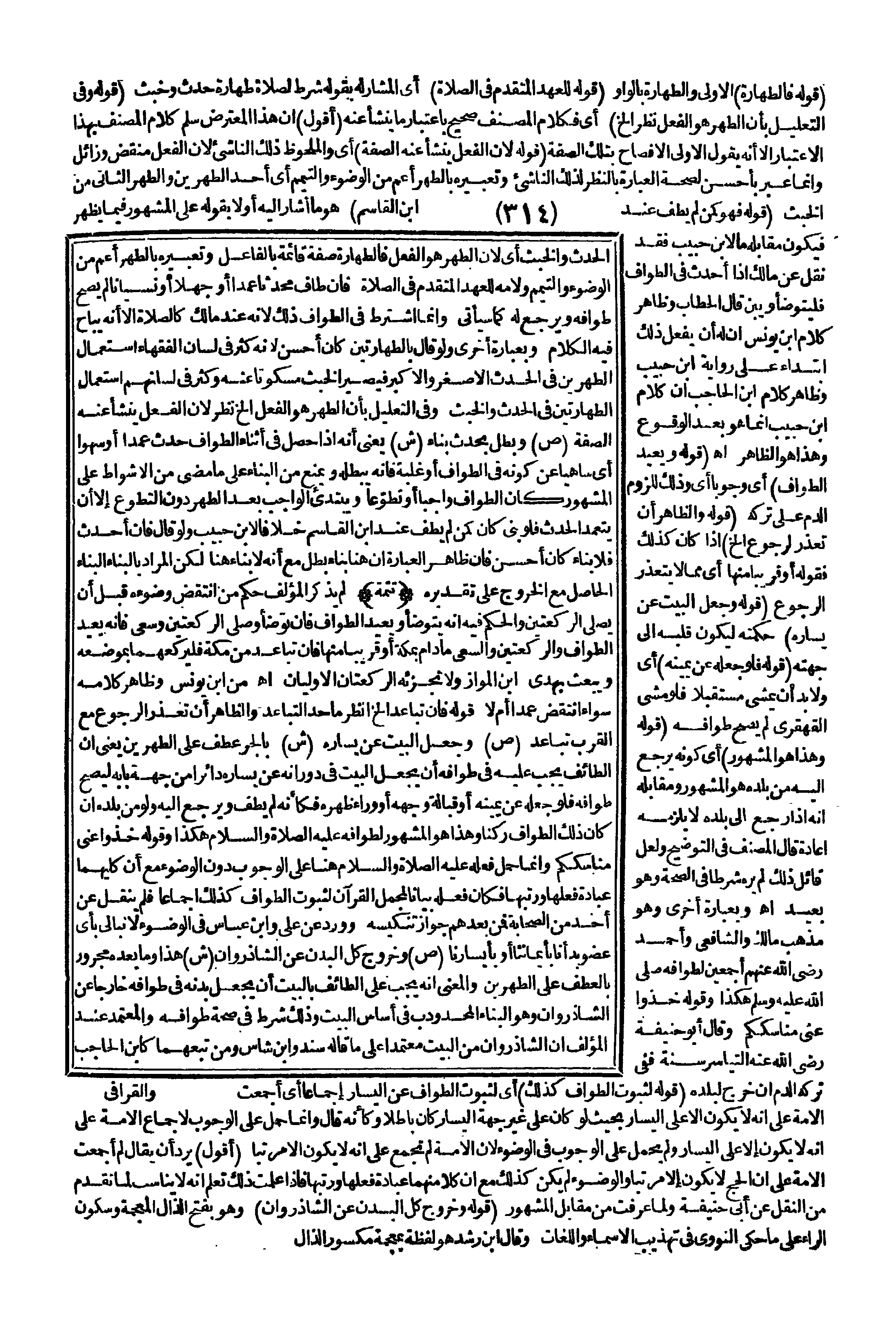 الْحَدَثِ وَالْخَبَثِ أَيْ:؛ لِأَنَّ الطُّهْرَ هُوَ الْفِعْلُ فَالطَّهَارَةُ صِفَةٌ قَائِمَةٌ بِالْفَاعِلِ، وَتَعْبِيرُهُ بِالطُّهْرِ أَعَمُّ مِنْ الْوُضُوءِ وَالتَّيَمُّمِ، وَلَامُهُ لِلْعَهْدِ الْمُتَقَدِّمِ فِي الصَّلَاةِ، فَإِنْ طَافَ مُحْدِثًا عَمْدًا، أَوْ جَهْلًا، أَوْ نِسْيَانًا لَمْ يَصِحَّ طَوَافُهُ وَيَرْجِعُ لَهُ كَمَا سَيَأْتِي، وَإِنَّمَا اُشْتُرِطَ فِي الطَّوَافِ ذَلِكَ؛ لِأَنَّهُ عِنْدَ مَالِكٍ كَالصَّلَاةِ إلَّا أَنَّهُ يُبَاحُ فِيهِ الْكَلَامُ، وَبِعِبَارَةٍ أُخْرَى وَلَوْ قَالَ بِالطَّهَارَتَيْنِ كَانَ أَحْسَنَ؛ لِأَنَّهُ كَثُرَ فِي لِسَانِ الْفُقَهَاءِ اسْتِعْمَالُ الطُّهْرَيْنِ فِي الْحَدَثِ الْأَصْغَرِ وَالْأَكْبَرِ فَيَصِيرُ الْخَبَثُ مَسْكُوتًا عَنْهُ وَكَثُرَ فِي لِسَانِهِمْ اسْتِعْمَالُ الطَّهَارَتَيْنِ فِي الْحَدَثِ وَالْخَبَثِ وَفِي التَّعْلِيلِ بِأَنَّ الطُّهْرَ هُوَ الْفِعْلُ إلَخْ نَظَرٌ؛ لِأَنَّ الْفِعْلَ يَنْشَأُ عَنْهُ الصِّفَةُ.